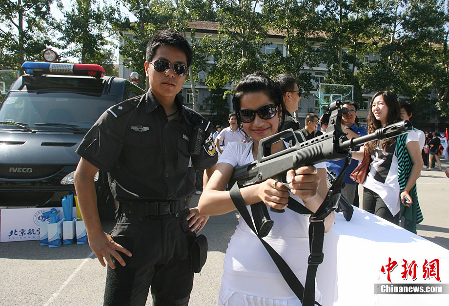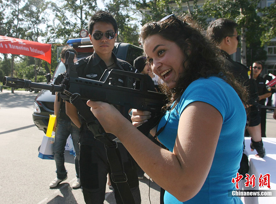 9月11日,北京語言大學(xué)一留學(xué)生在北京特警的講解下試用新型警用槍支。當(dāng)日,北京市公安局在北京語言大學(xué)舉辦“平安北京進(jìn)校園”主題活動(dòng)。民警通過面對(duì)面的交流為外國留學(xué)生提供咨詢服務(wù),用英、德、西、日、韓5種語言,解答外國留學(xué)生在京居留、學(xué)習(xí)生活方面的各種問題,致力于提高外國留學(xué)生的安全感和滿意度。中新社發(fā) 蘇丹 攝
