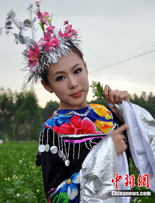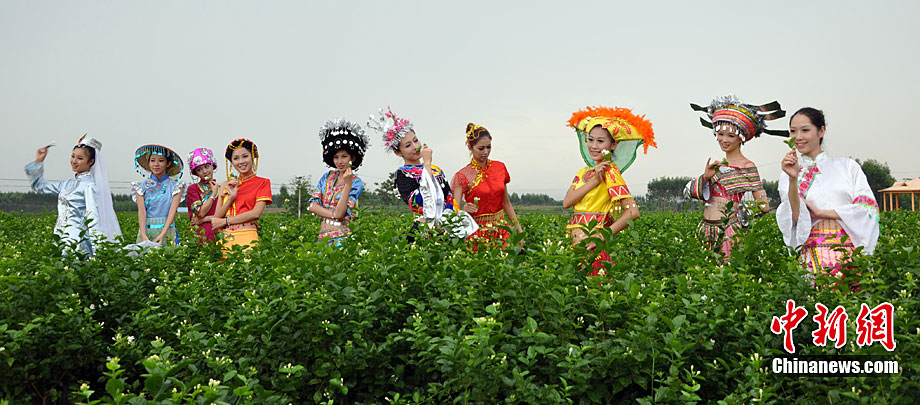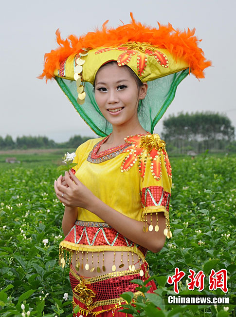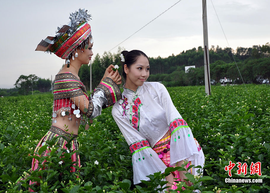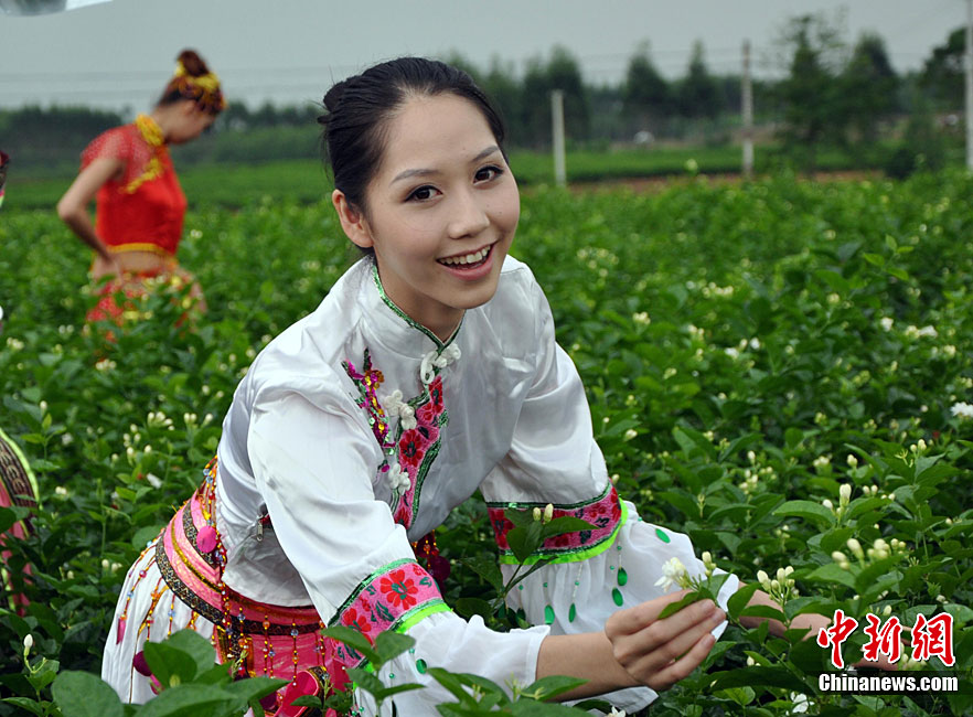 9月11日,“中國茉莉之鄉(xiāng)”廣西南寧橫縣,少數(shù)民族美女在“中華茉莉園”忙采茶。9月10日至12日,由中國花卉協(xié)會花文化專業(yè)委員會、中國茶葉流通協(xié)會茶館專業(yè)委員會和南寧市人民政府主辦的2010年中國國際茉莉花文化節(jié)在廣西橫縣舉行。橫縣是世界最大的茉莉花生產(chǎn)和花茶加工基地,茉莉花種植面積達到10萬畝,花農(nóng)33萬人,年產(chǎn)鮮花8萬多噸,茉莉花產(chǎn)量和花茶加工總量均占全國80%以上,占世界的60%。中新社記者 楊志雄 攝