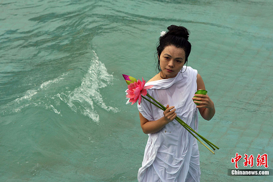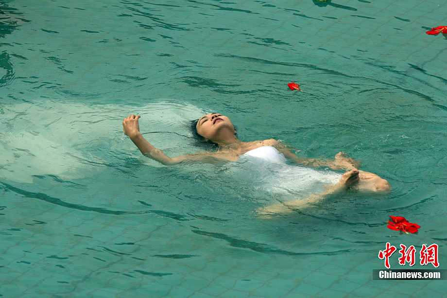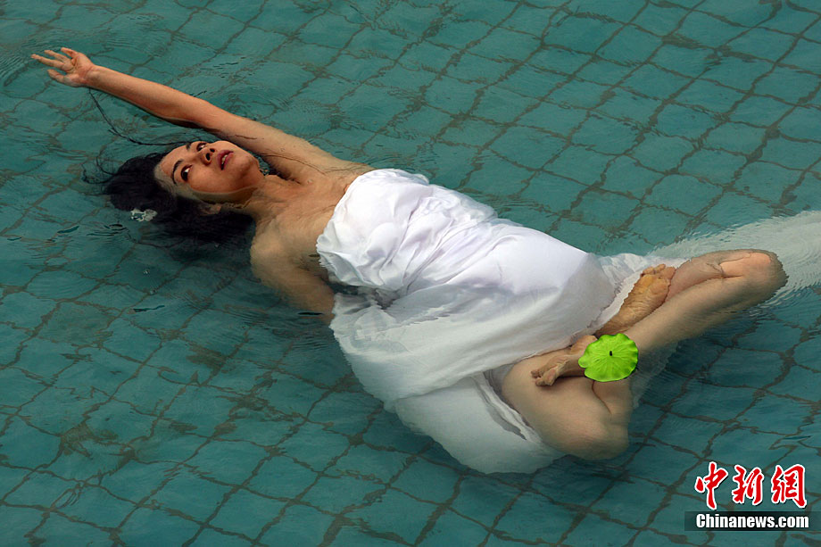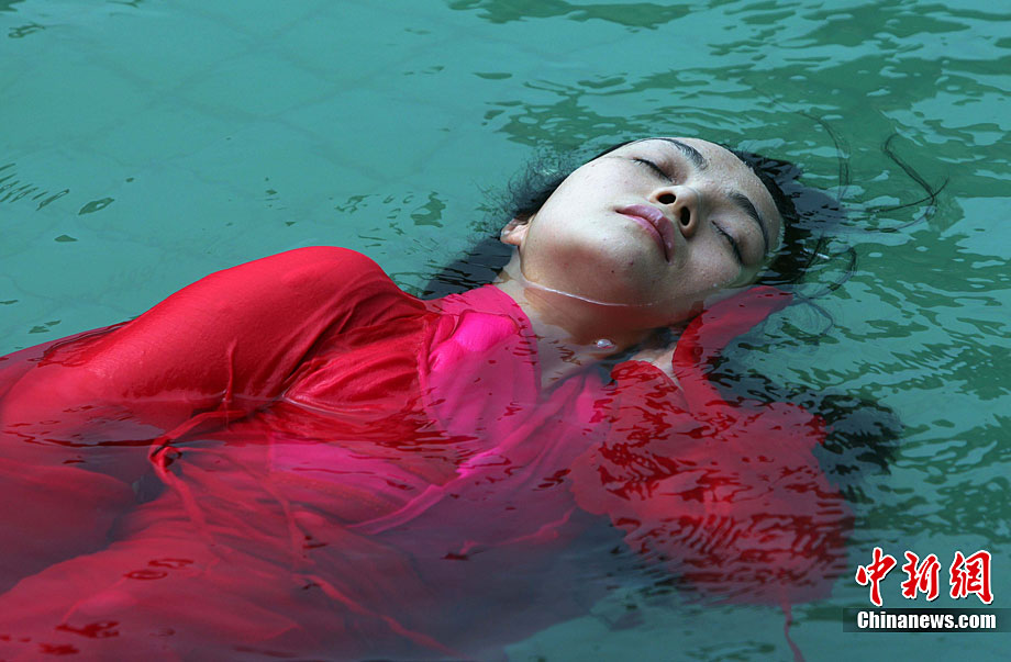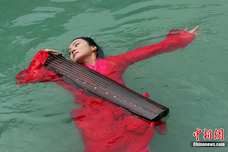 9月11日,漂浮于水上時而禪坐、時而圍繞水中漂浮的古琴緩緩起舞,伴著古琴樂,池水不時變換出各種造型的“水墨畫”,一種前沿新藝術(shù)形式在湖北咸寧太乙洞溫泉上演。原創(chuàng)及表演者彭子軒,提出藝術(shù)養(yǎng)生的理念,并獨創(chuàng)以子軒內(nèi)練為基礎(chǔ)的藝術(shù)漂。ò囆g(shù)漂浮舞蹈及藝術(shù)漂浮瑜伽),被譽為中國古典花樣游泳。毛建軍 攝