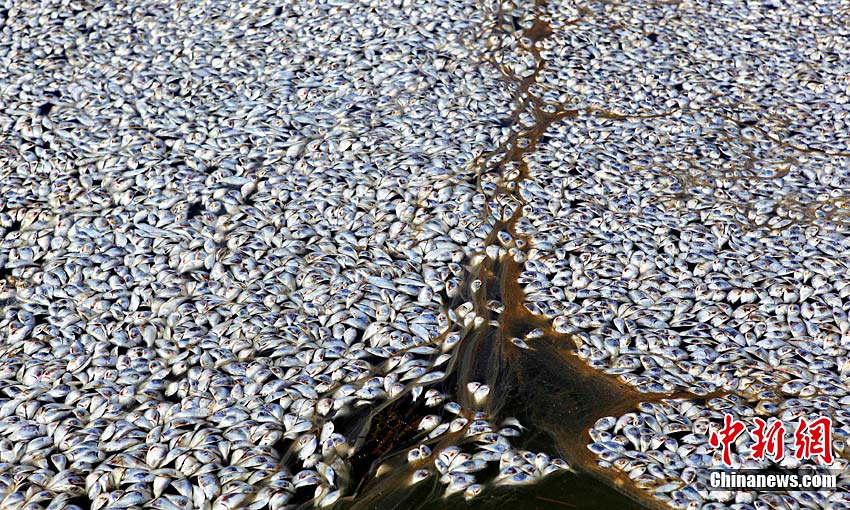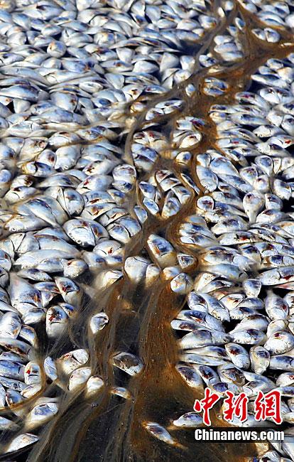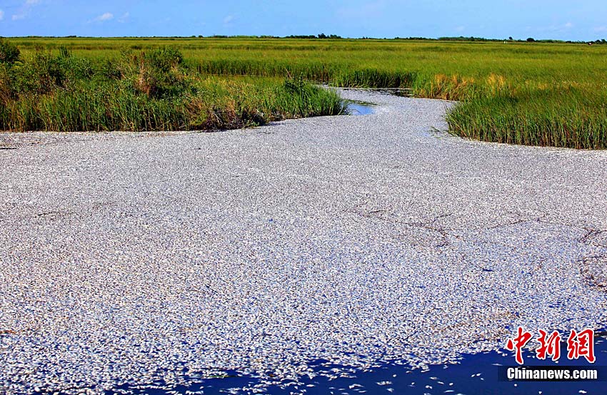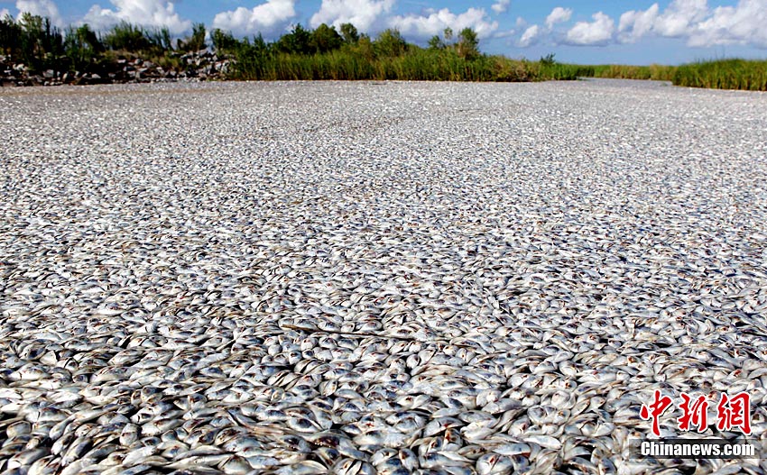 近日,人們?cè)诿绹?guó)路易斯安那州普拉克明縣發(fā)現(xiàn)大批漂浮在緩流溪上的死亡魚(yú)群。目前,這批魚(yú)的死亡原因不明,但懷疑與墨西哥灣漏油事件有關(guān)。圖為9月10日在美國(guó)路易斯安那州普拉克明縣拍攝的大批死魚(yú)。