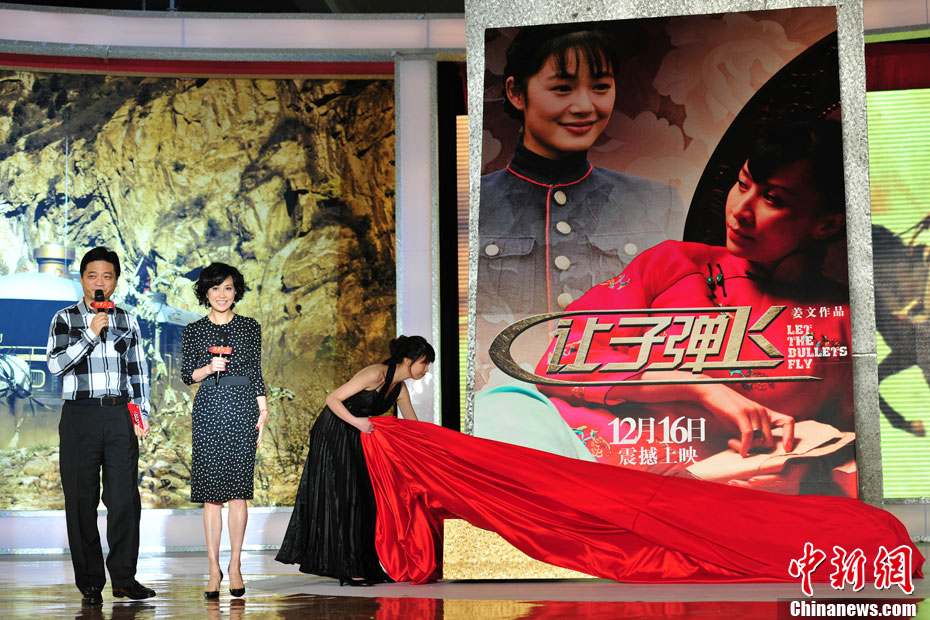 9月16日,將于12月26日震撼上映的電影《讓子彈飛》導(dǎo)演姜文攜主演劉嘉玲、廖凡、邵兵亮相北京,為即將上映的新作站臺(tái)宣傳。當(dāng)回答“票房預(yù)期”時(shí),姜文自信的表示“我們這個(gè)戲里有葛優(yōu),有周潤(rùn)發(fā),以前別人說(shuō)一個(gè)電影‘不優(yōu)不發(fā)’或者說(shuō)‘不發(fā)不優(yōu)’。那我們這個(gè)片子里又有(葛)優(yōu)又有(周潤(rùn))發(fā),我都不敢想能賣多少了! 女主角劉嘉玲在片中“情挑”姜文、周潤(rùn)發(fā)、葛優(yōu)三影帝。她更是對(duì)《讓子彈飛》成為今年內(nèi)地票房冠軍充滿信心,表示假如梁朝偉《一代宗師》趕上賀歲檔,樂(lè)意打敗他們。