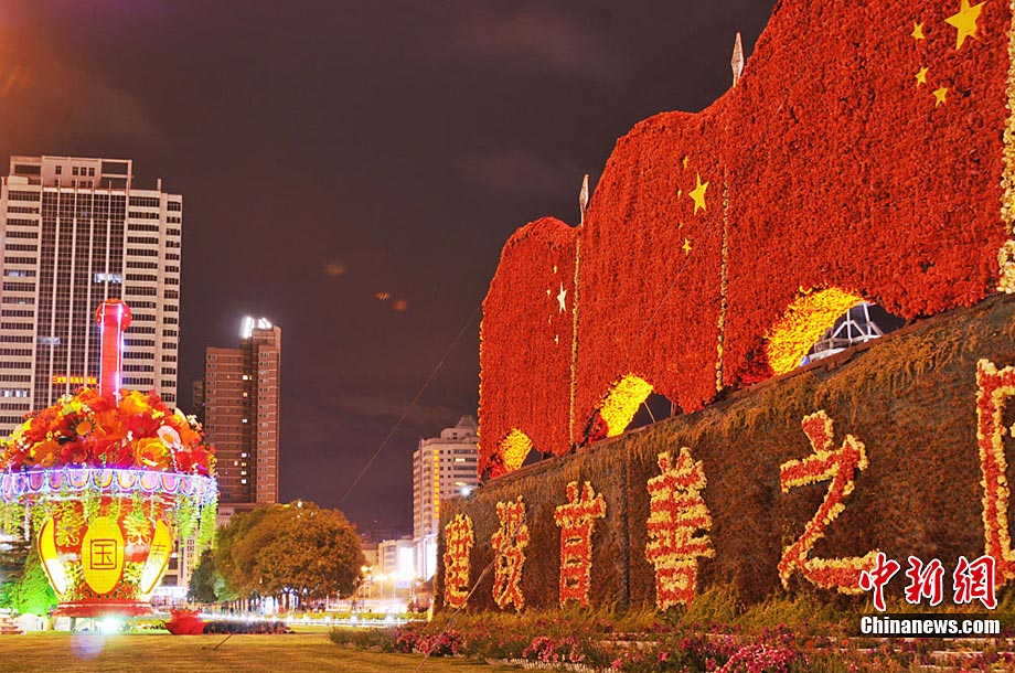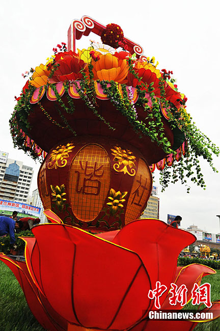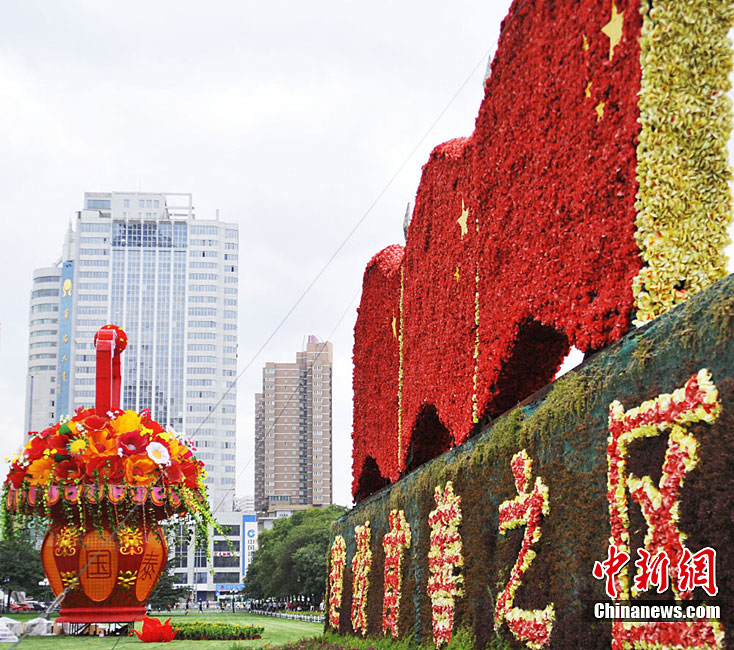 9月20日,中秋、國慶雙節(jié)即將到來,蘭州東方紅廣場布置一新,花籃上標注有“和諧社會”與“國泰民安”。 楊艷敏 攝