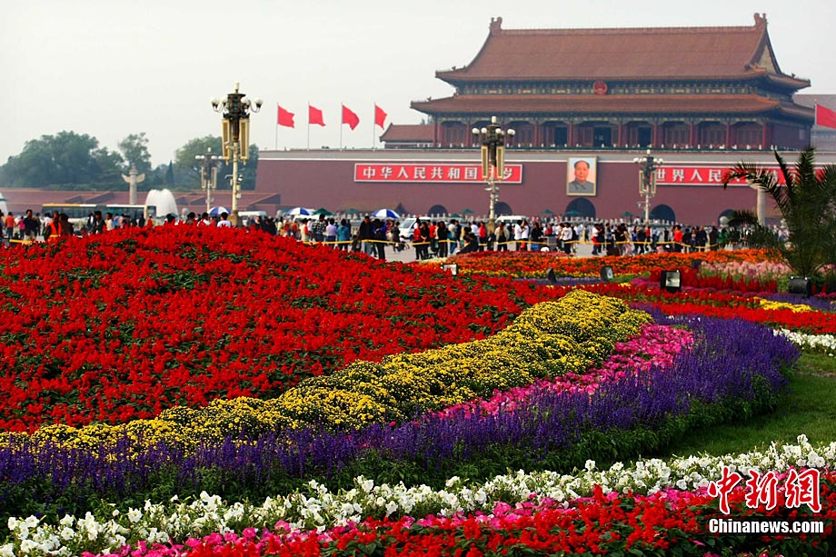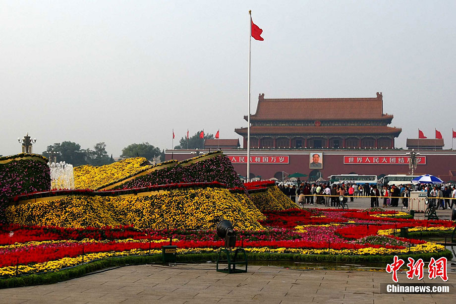 9月25日上午,北京市園林綠化局宣傳中心對(duì)外宣布,為了迎接建國61周年,天安門廣場(chǎng)主題為“花開盛世”的中心水法花壇已經(jīng)安裝完畢并正式亮相。吳間道 攝 圖片來源:cnsphoto