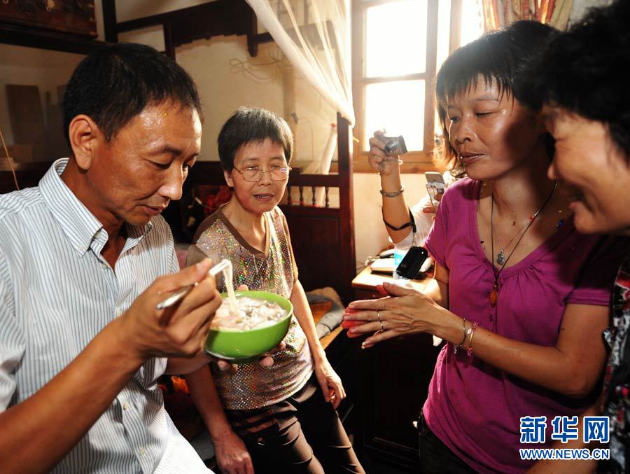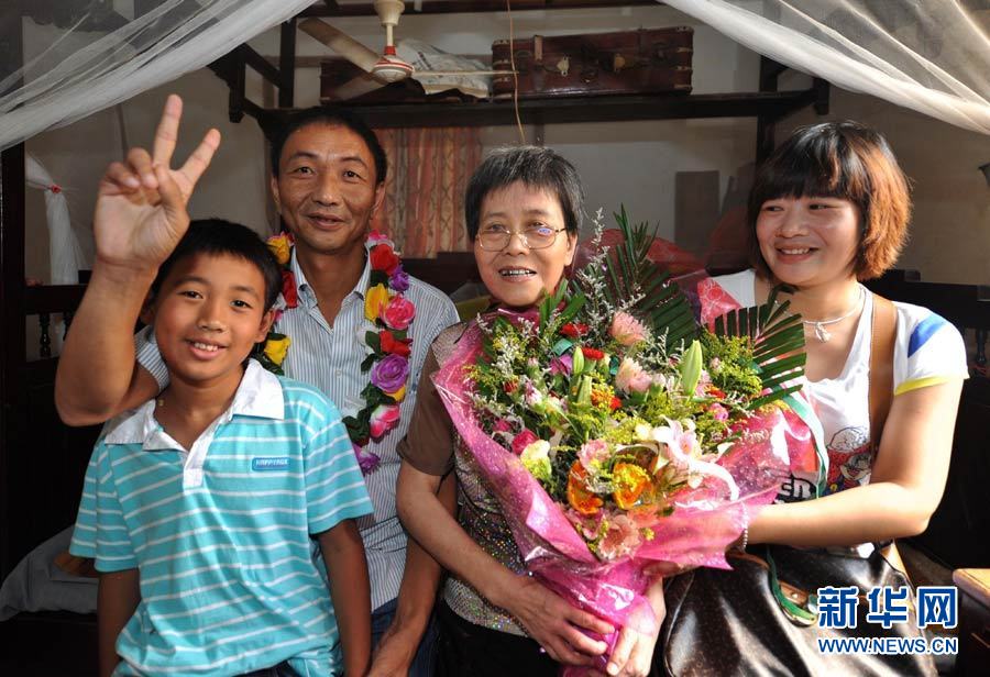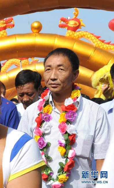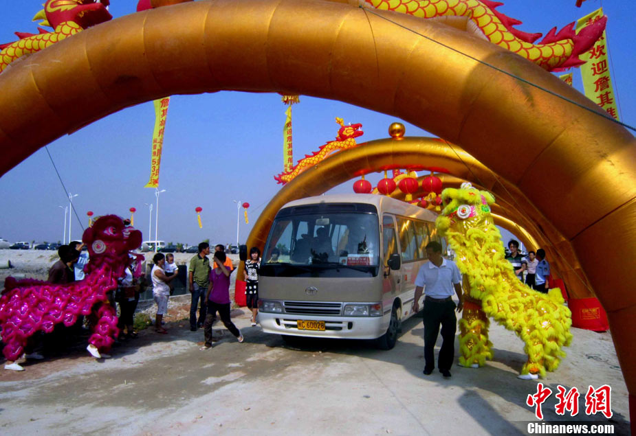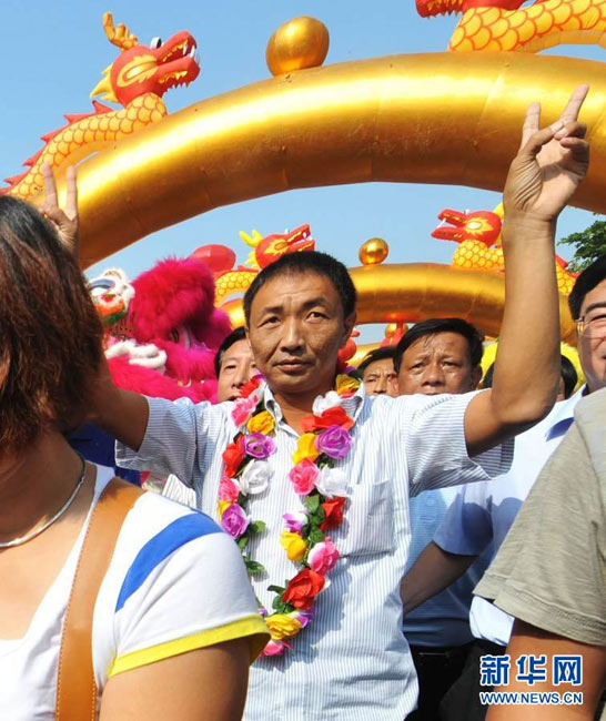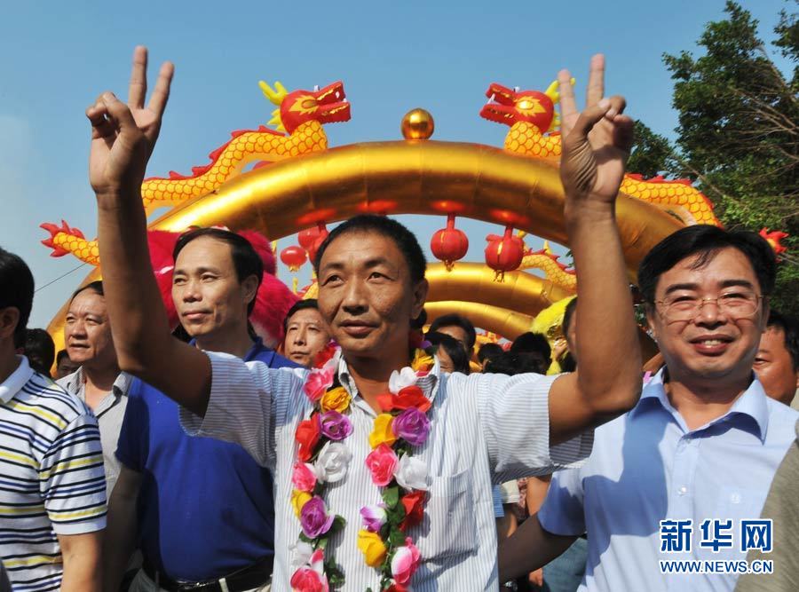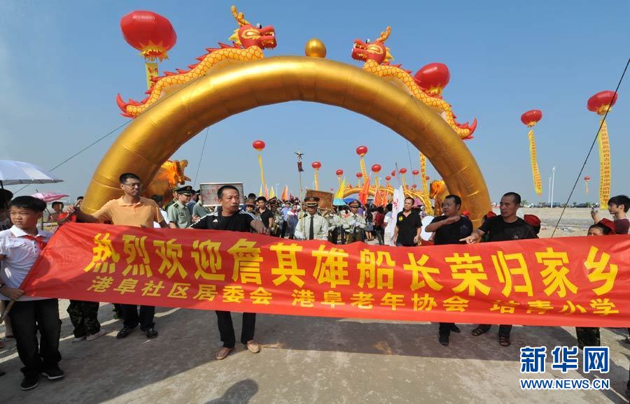 9月27日,被日方非法抓扣的中國(guó)漁船船長(zhǎng)詹其雄返回家鄉(xiāng)--福建晉江市深滬鎮(zhèn)港滬村。當(dāng)?shù)剜l(xiāng)親熱情迎接他歸來。圖為詹其雄(圖中)下車后笑容滿面,受到了當(dāng)?shù)孛癖姷臒崃覛g迎。中新社發(fā) 孫虹 攝