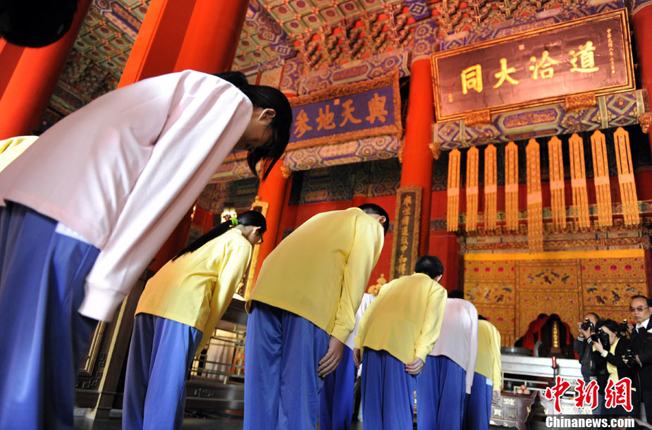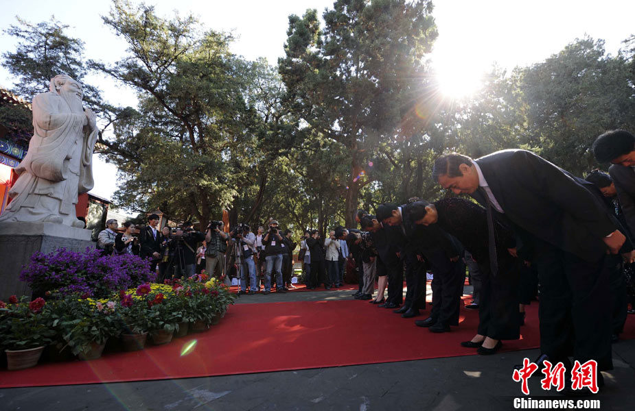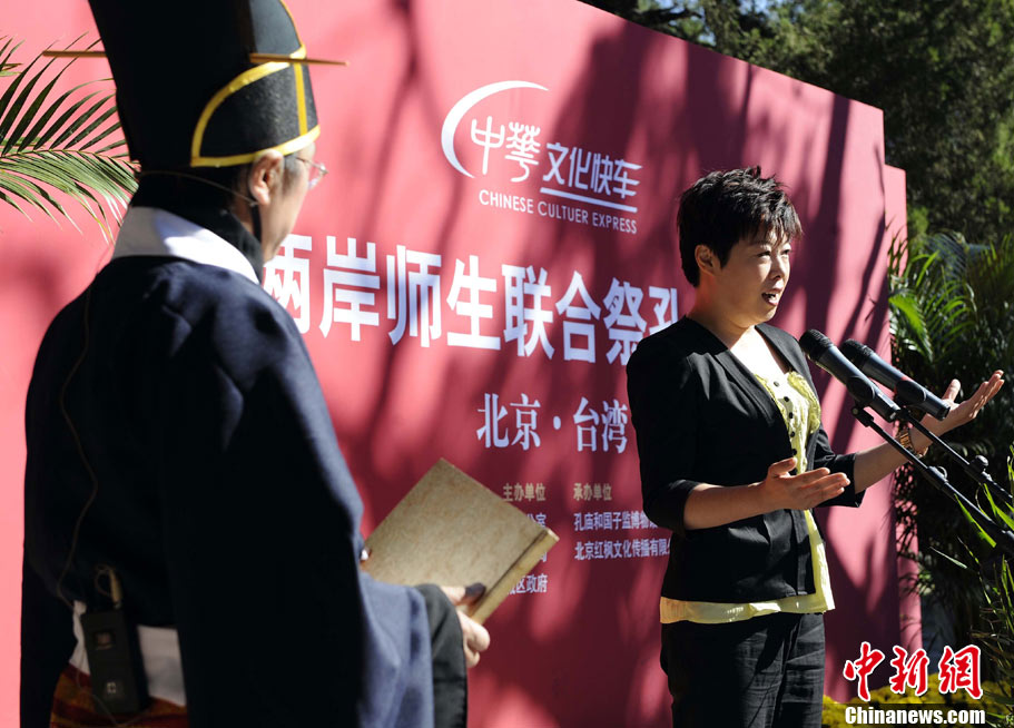 9月28日上午,兩岸師生聯(lián)合祭孔大典儀式在北京孔廟舉行。來自臺(tái)灣和北京的兩岸師生共計(jì)500人,共同祭奠孔子,弘揚(yáng)中華傳統(tǒng)文化。中新社記者 劉震 攝