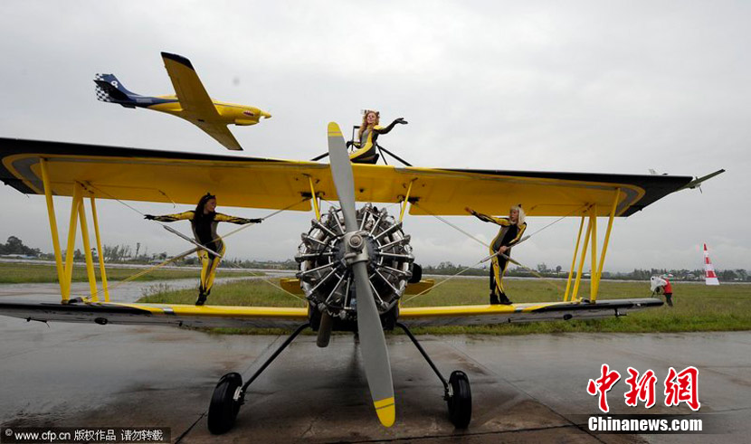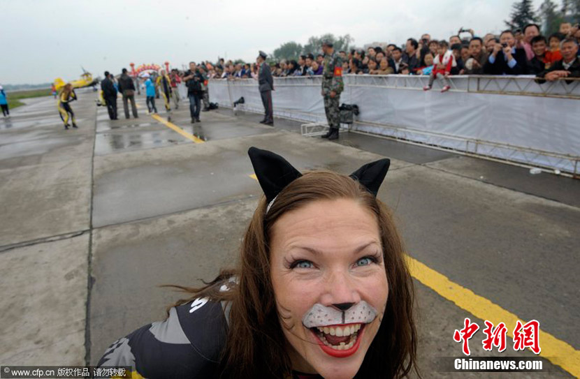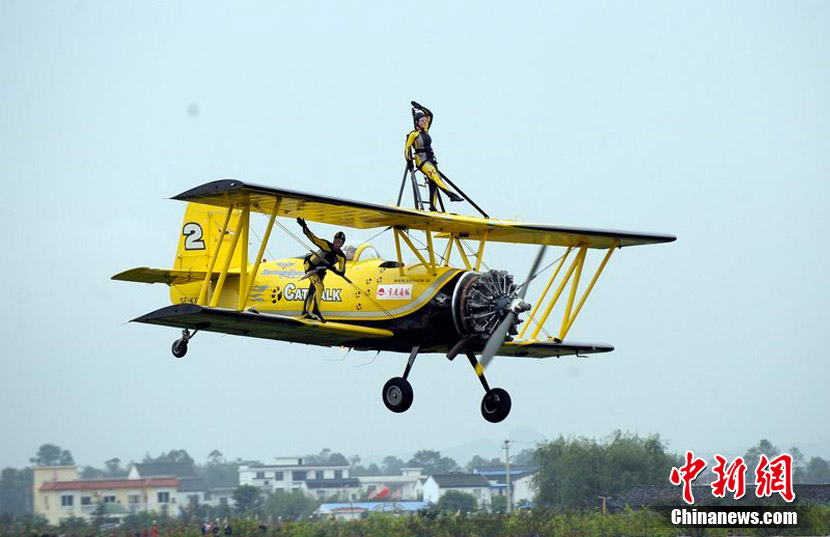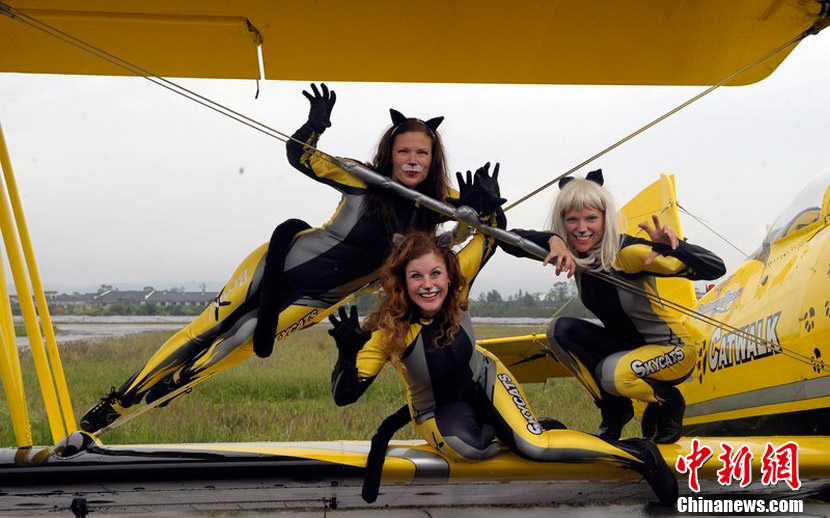 2010年9月30日,2010年首屆中國(重慶)國際飛行愛好者年會暨國際通用航空器展示交易會在重慶梁平縣開幕。雖本場航空表演僅對專業(yè)人士開放,仍然吸引了3萬人涌進(jìn)梁平機(jī)場。圖為瑞典貓女郎準(zhǔn)備進(jìn)行“機(jī)翼行走”特技表演。圖片來源:CFP視覺中國