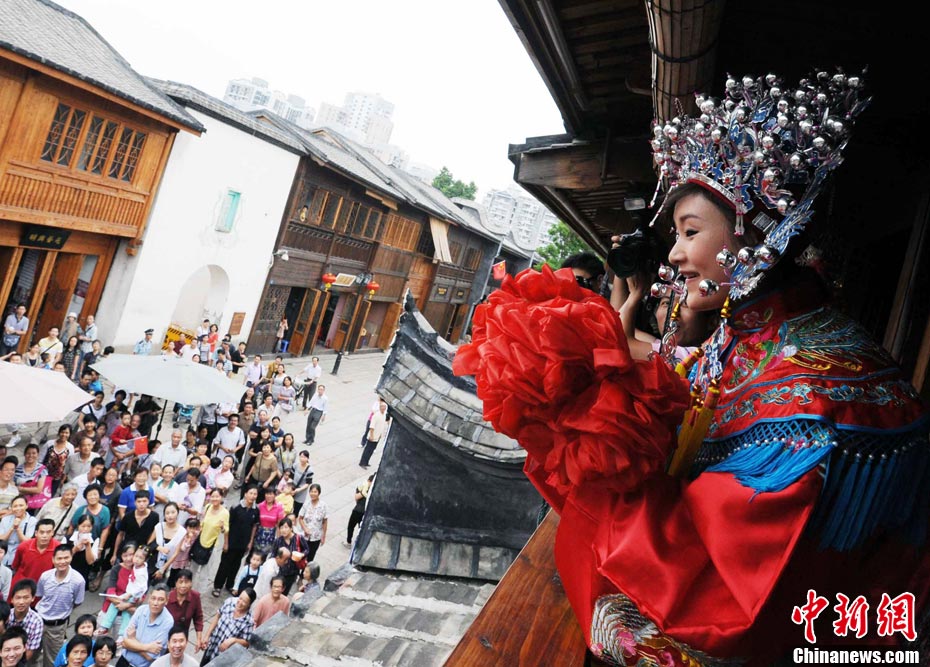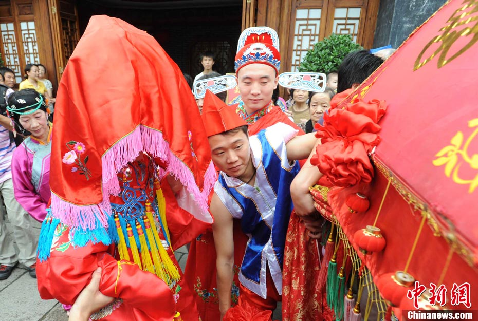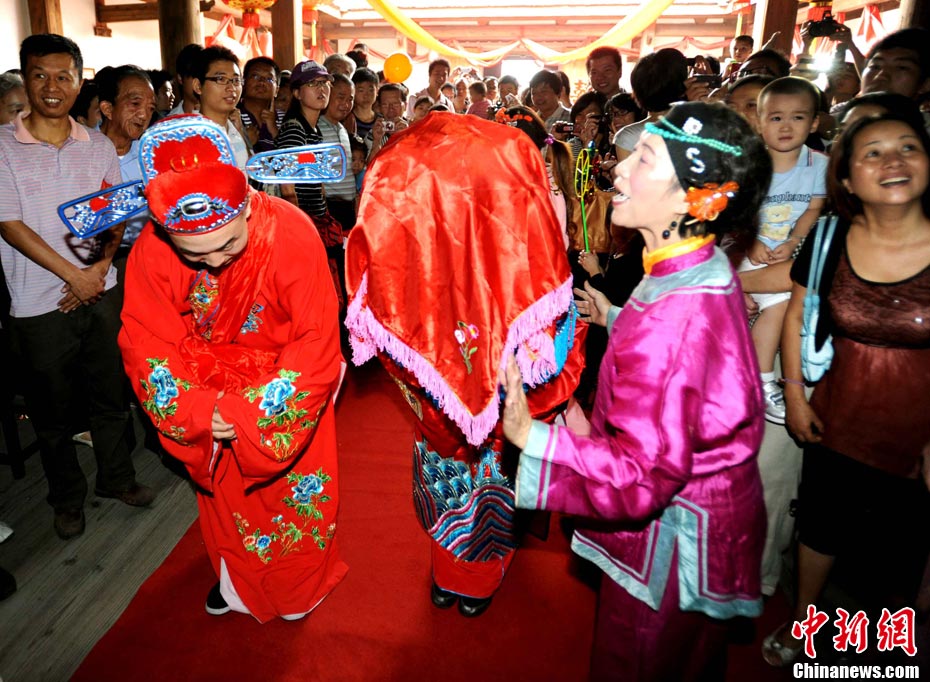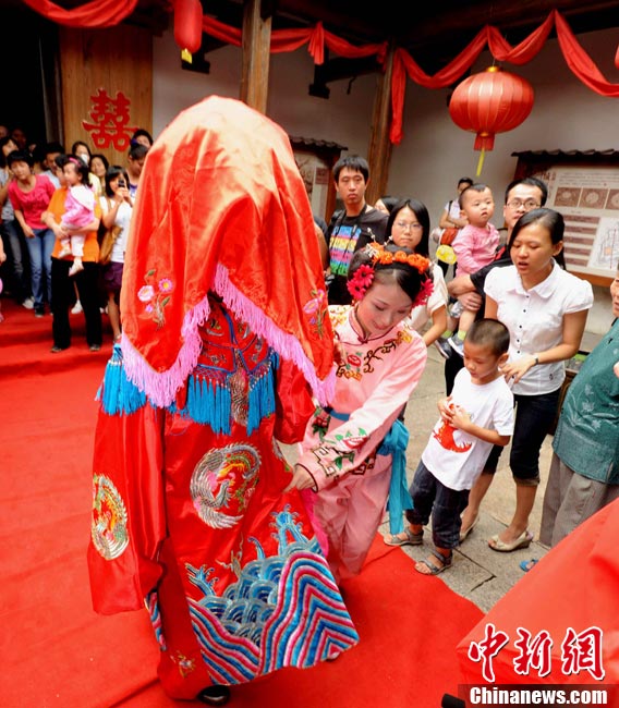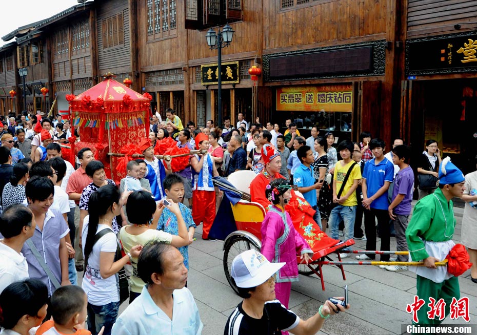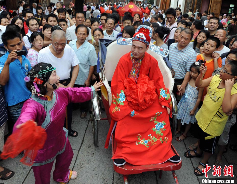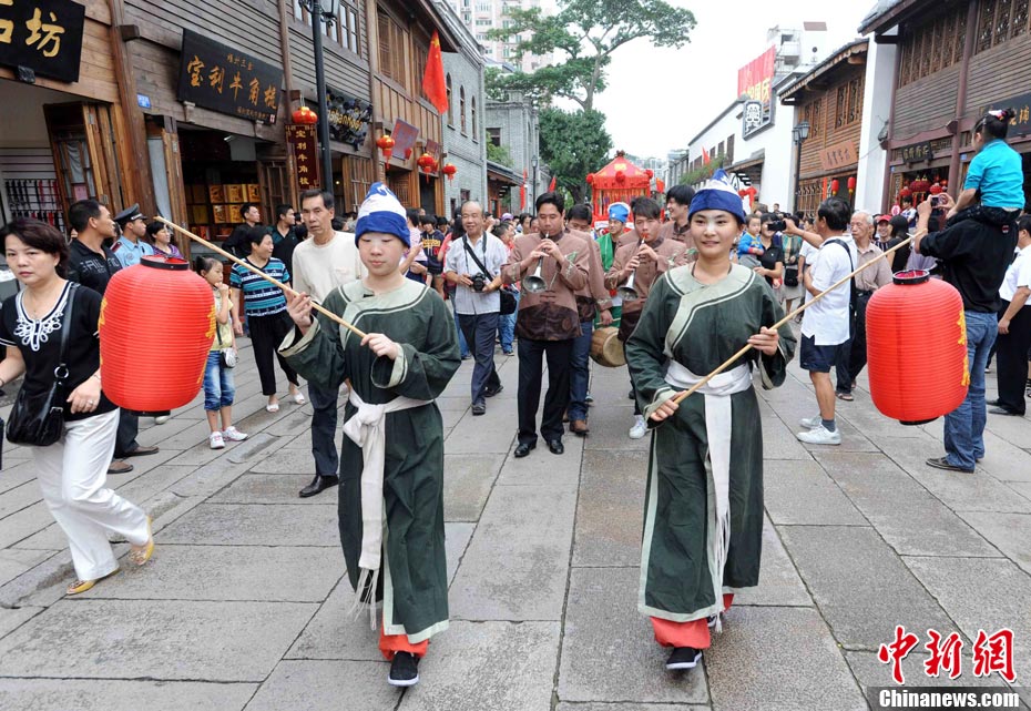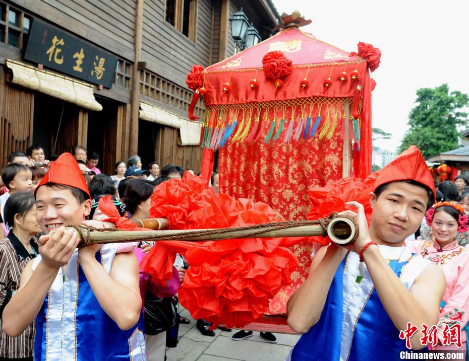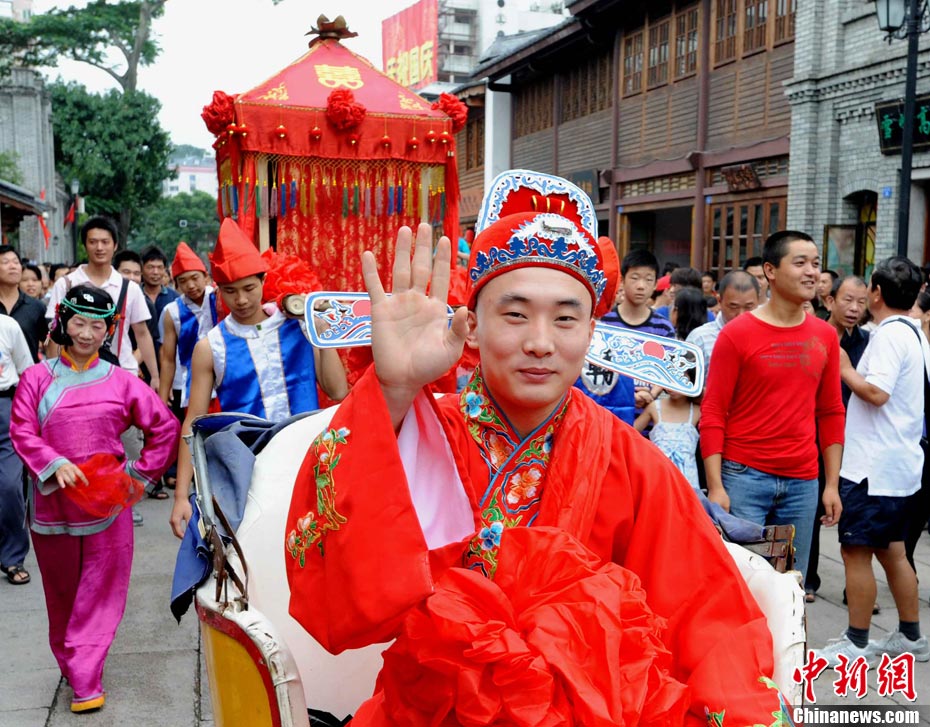 10月1日國(guó)慶節(jié),福州古街上演一場(chǎng)傳統(tǒng)民俗婚禮令眾多游客爭(zhēng)睹。該傳統(tǒng)民俗婚禮分起轎、回車馬、迎轎、下轎、祭拜天地、入洞房等場(chǎng)面喜慶。