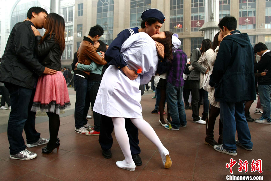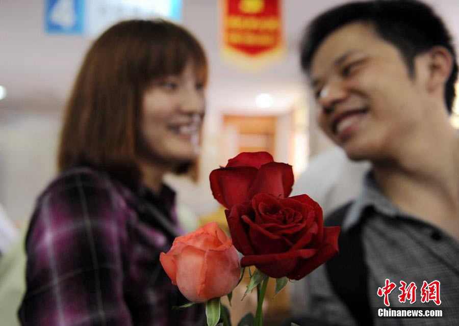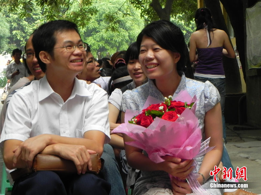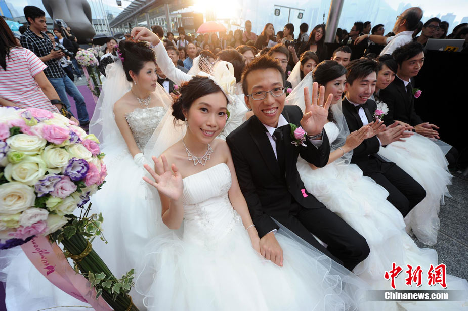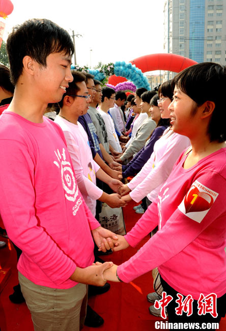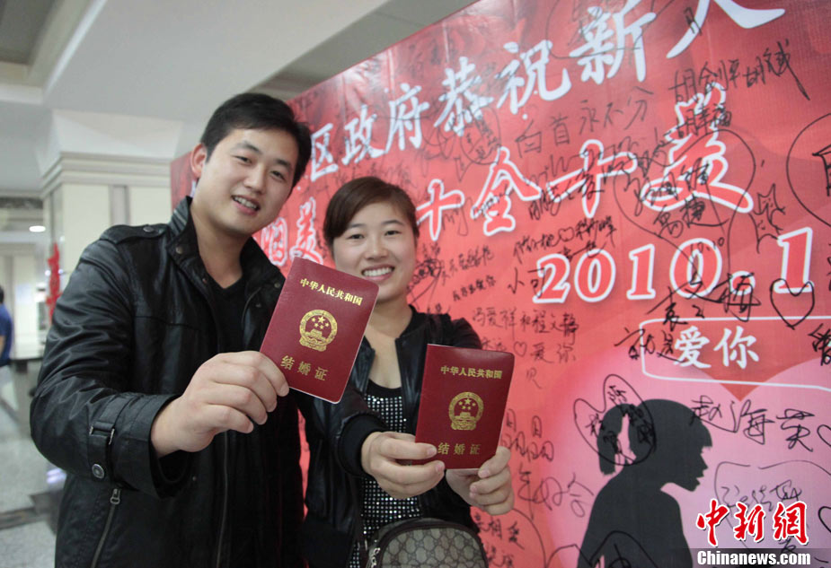 2010年10月10日,全國(guó)各地新人辦理結(jié)婚登記。很多新人選擇被寓意“十全十美”的好日子領(lǐng)結(jié)婚證。圖為鄭州出現(xiàn)結(jié)婚登記高峰,導(dǎo)致各區(qū)民政局婚姻登記處門前都排起長(zhǎng)長(zhǎng)的隊(duì)伍。一對(duì)新人在長(zhǎng)長(zhǎng)的隊(duì)伍中手挽手排除等候。沙浪 攝 圖片來(lái)源:CFP視覺(jué)中國(guó)
