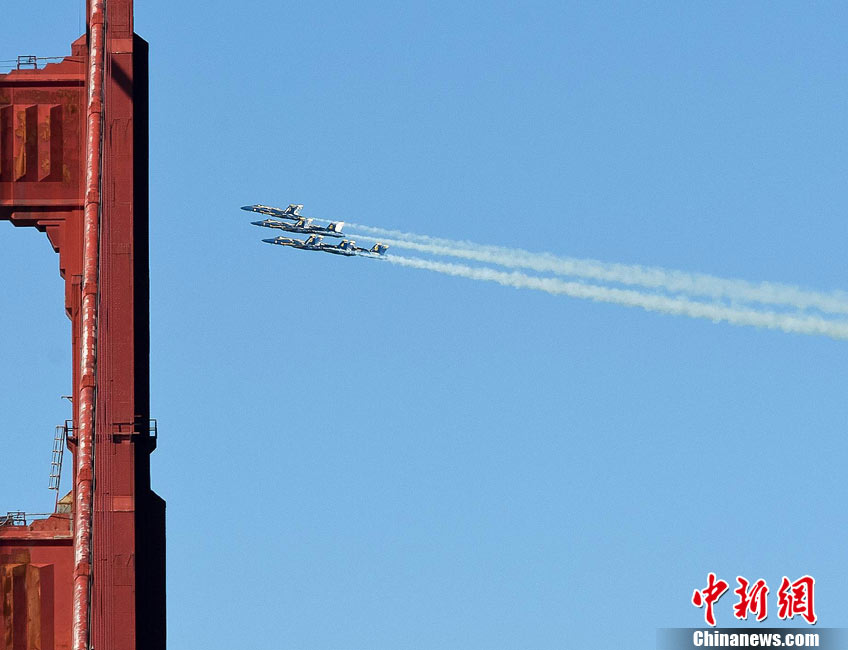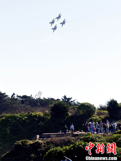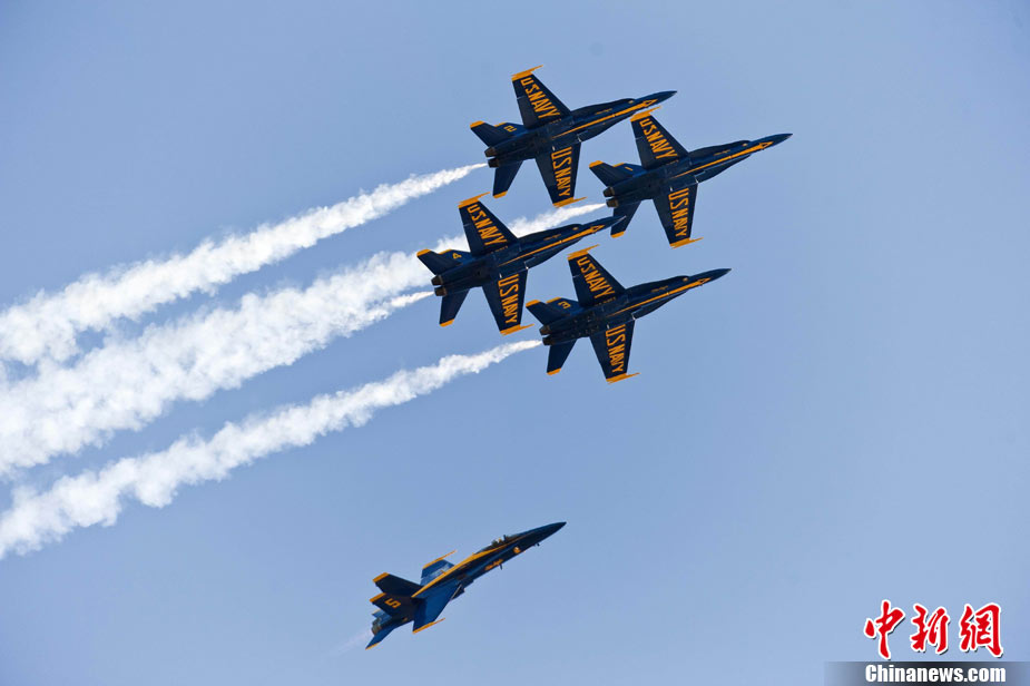 當?shù)貢r間10月9日下午,美國海軍藍天使飛行表演隊在舊金山舉行一年一度的“艦隊周”活動。圖為5架F-18戰(zhàn)斗機編隊表演。 中新社發(fā) 陳鋼 攝