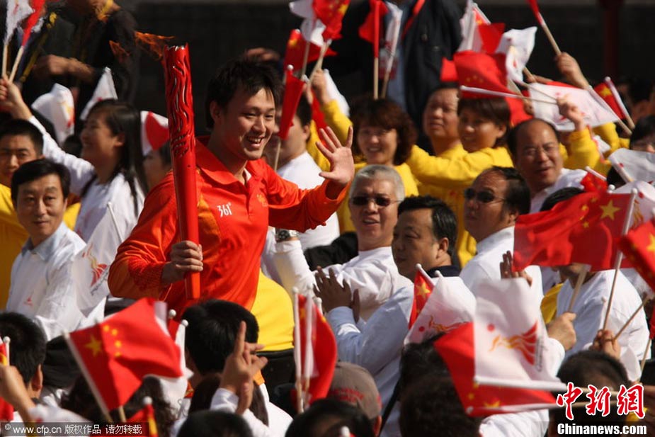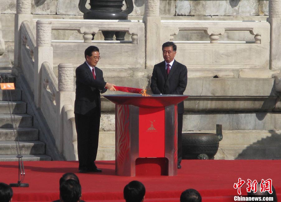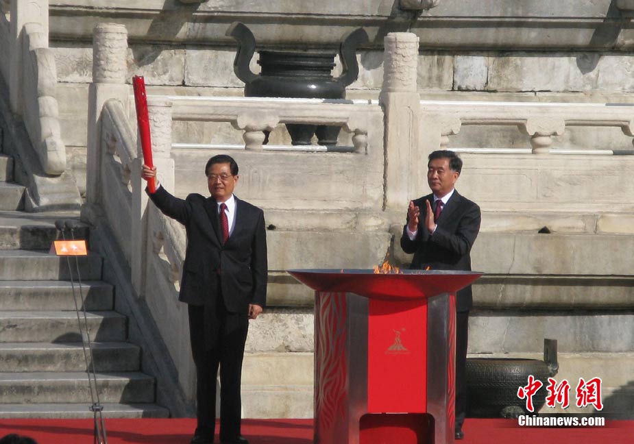 10月12日上午,廣州亞運會火炬點燃暨傳遞啟動儀式在北京天壇祈年殿南廣場舉行。10點17分,中共中央總書記、國家主席胡錦濤點燃主火炬。 中新社記者 沈晨 攝