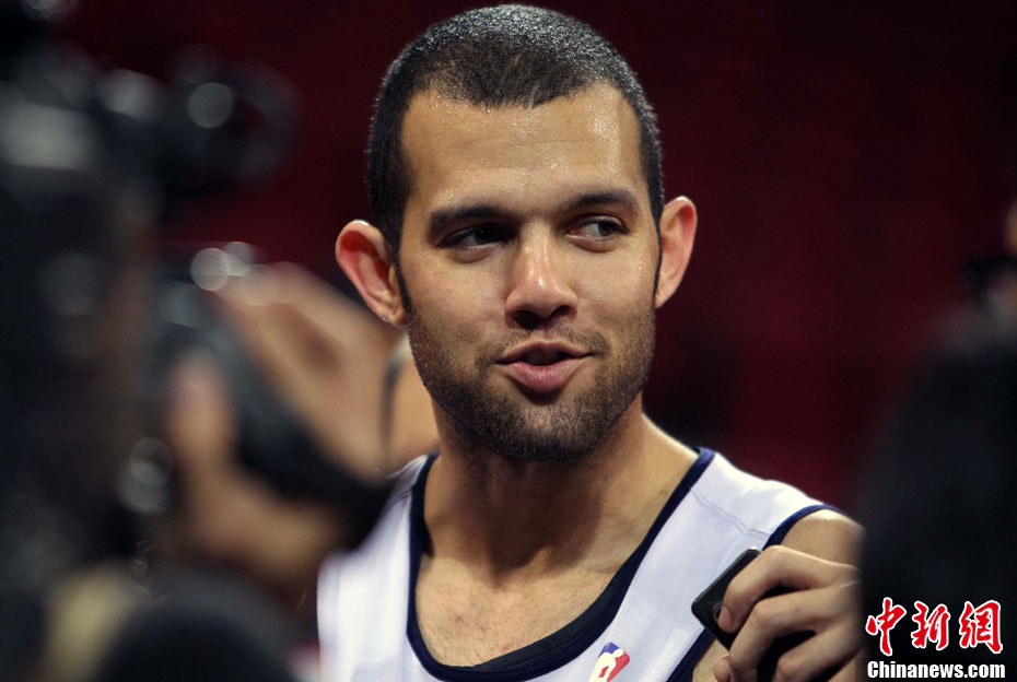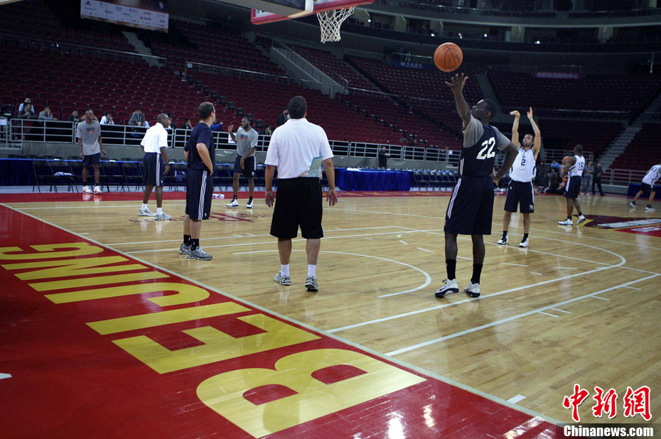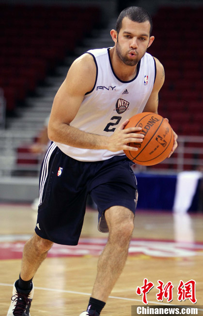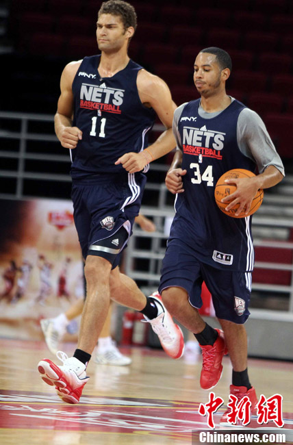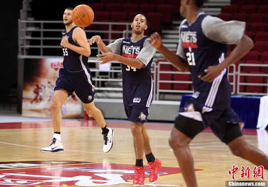 10月12日中午,新澤西網(wǎng)隊(duì)在北京五棵松體育館訓(xùn)練并接受了媒體采訪;火箭隊(duì)則由于凌晨剛剛抵達(dá)北京而取消了訓(xùn)練。據(jù)悉,兩場(chǎng)比賽的門票已經(jīng)售罄。中新社記者 任晨鳴 攝