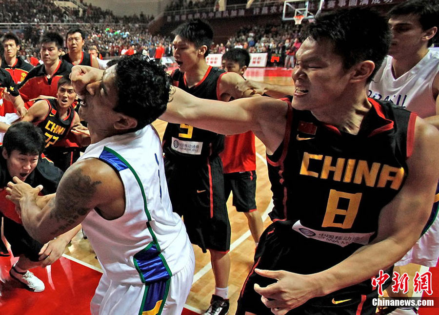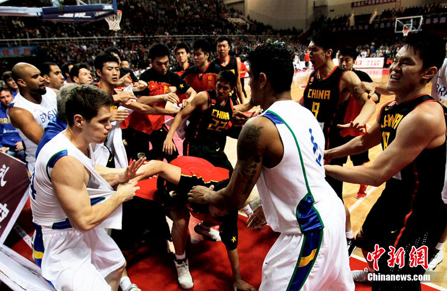 10月12日,河南許昌,2010男籃亞運(yùn)熱身賽第3場(chǎng),中國(guó)Vs巴西。雙方發(fā)生摩擦,爆發(fā)群毆。圖片來(lái)源:CFP視覺中國(guó)
