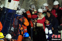 智利首名升井礦工弗洛倫西奧•阿瓦洛斯(Florencio Avalos)北京時(shí)間13日上午11點(diǎn)10分左右搭乘特制救生艙回到地面,成功獲救。目前,救援工作成功邁出第一步,救生艙接下來(lái)將繼續(xù)放入井下,營(yíng)救其余32名被困礦工。圖為阿瓦洛斯出井后與智利總統(tǒng)皮涅拉擁抱。