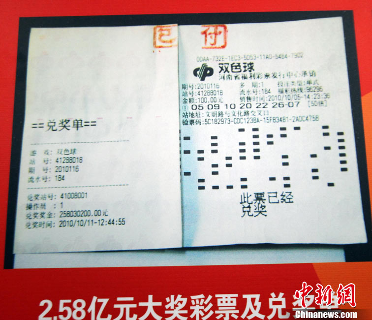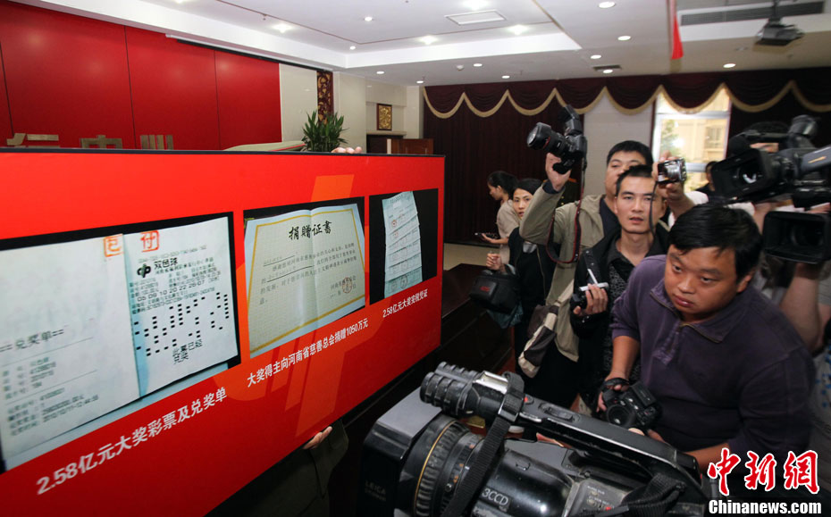 10月13日,河南福彩中心召開新聞發(fā)布會通報雙色球2.58億兌獎情況,2.58億巨獎彩票在發(fā)布會上曝光。巨獎于本周一被兌取,得主是一位長期從事教育職業(yè)的駐馬店本地人,他的大獎為機選1注后50倍投,他將捐款1050萬,為目前中國彩市大獎得主單筆最高捐款。2.58億是繼2009年安陽彩民獲3.59億后,河南彩民攬獲的又一個超級巨獎。中新社記者 王中舉 攝