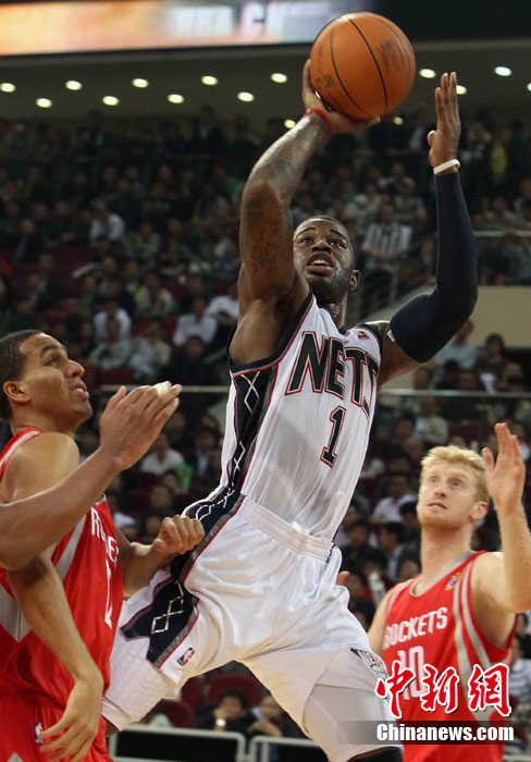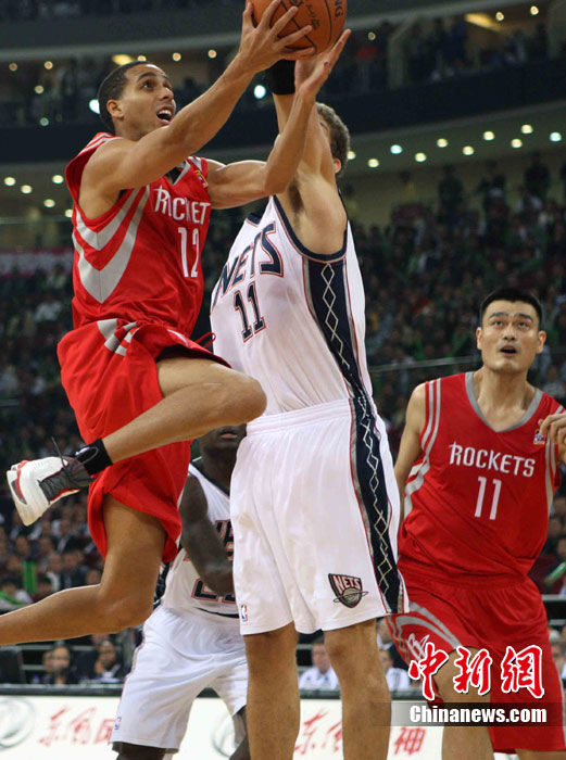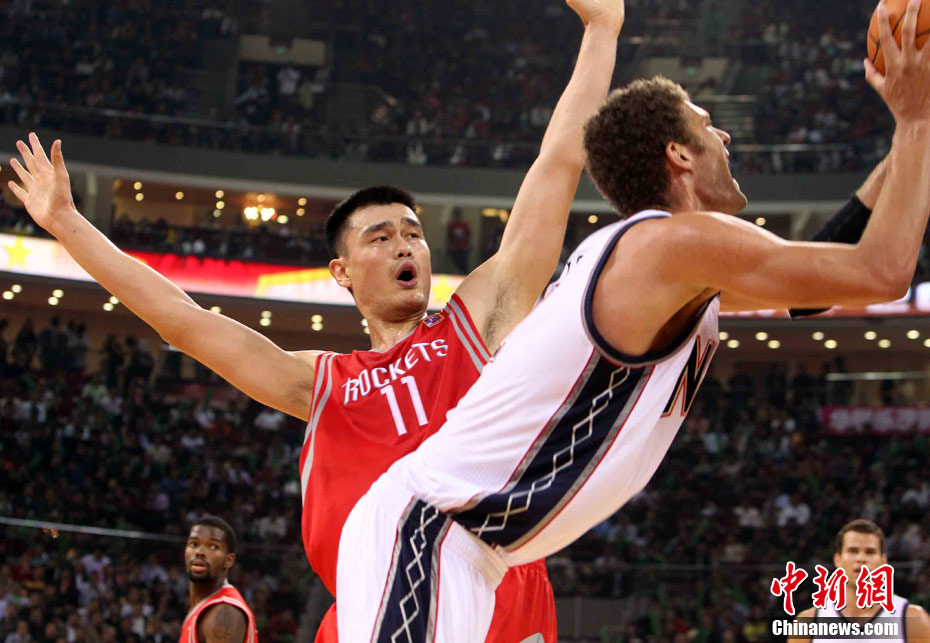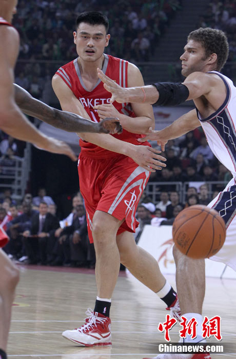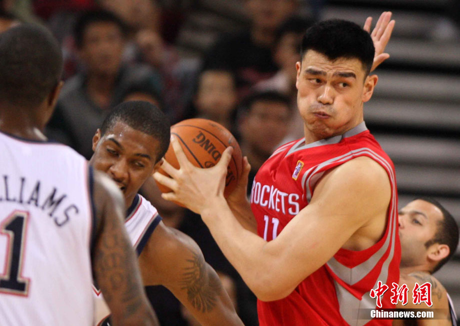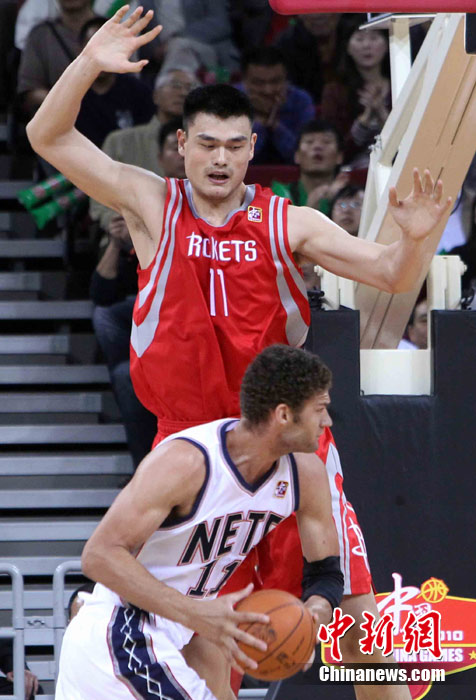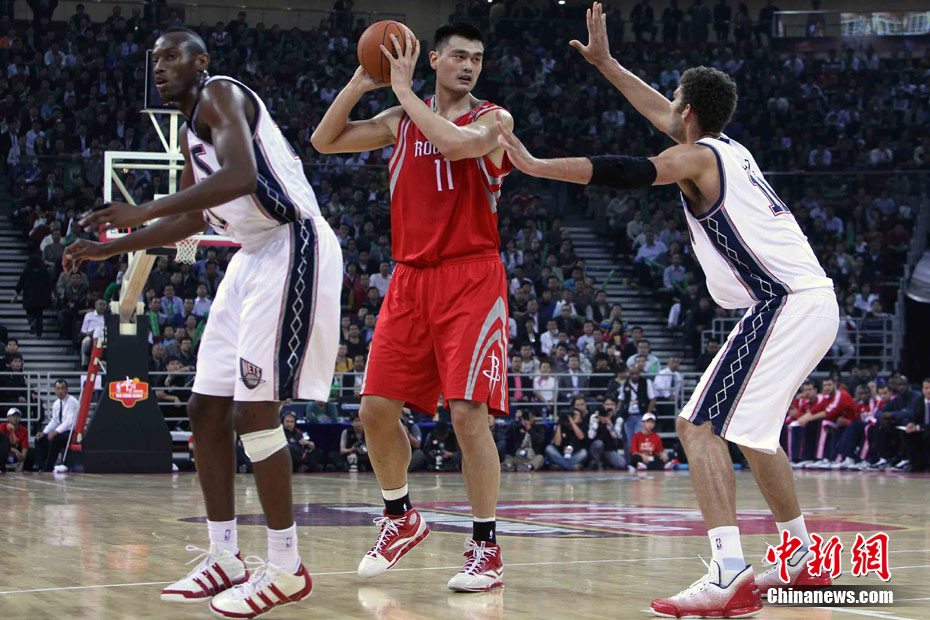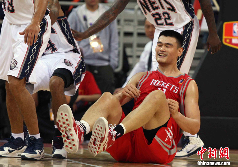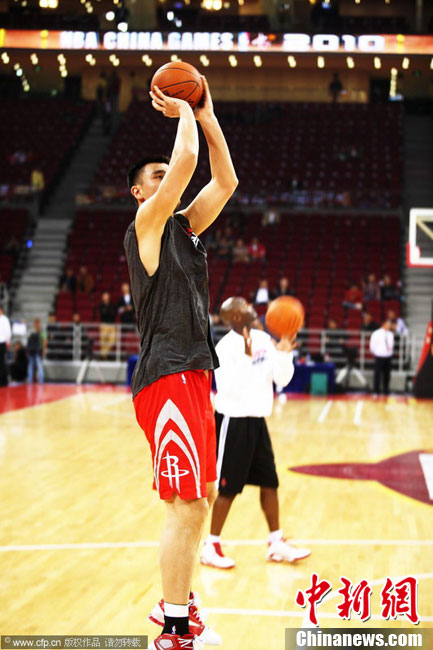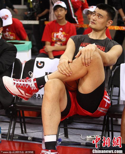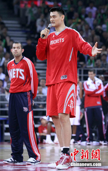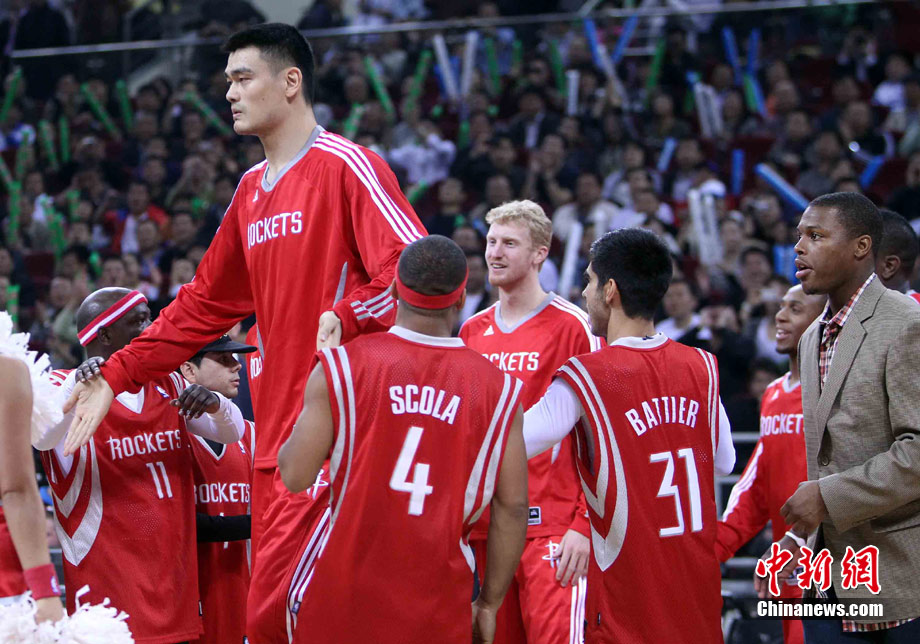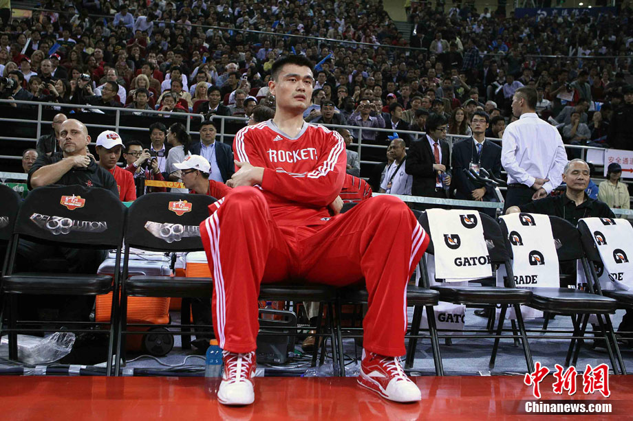 10月13日,NBA中國賽第一場比賽在北京五棵松體育館舉行,休斯敦火箭隊迎戰(zhàn)新澤西網(wǎng)隊。兩支球隊將于本月16日在廣州進行第二場比賽。圖為姚明熱身后在場邊休息。圖片來源:CFP視覺中國