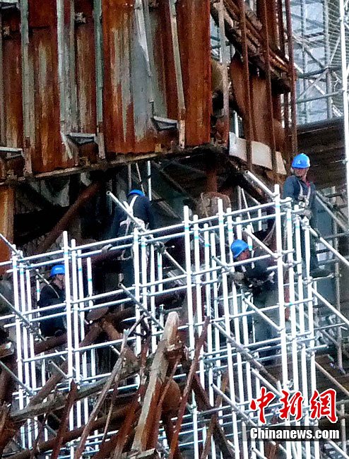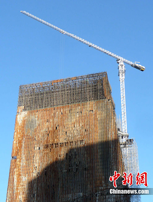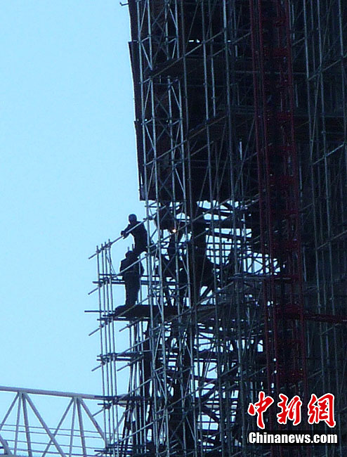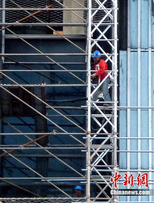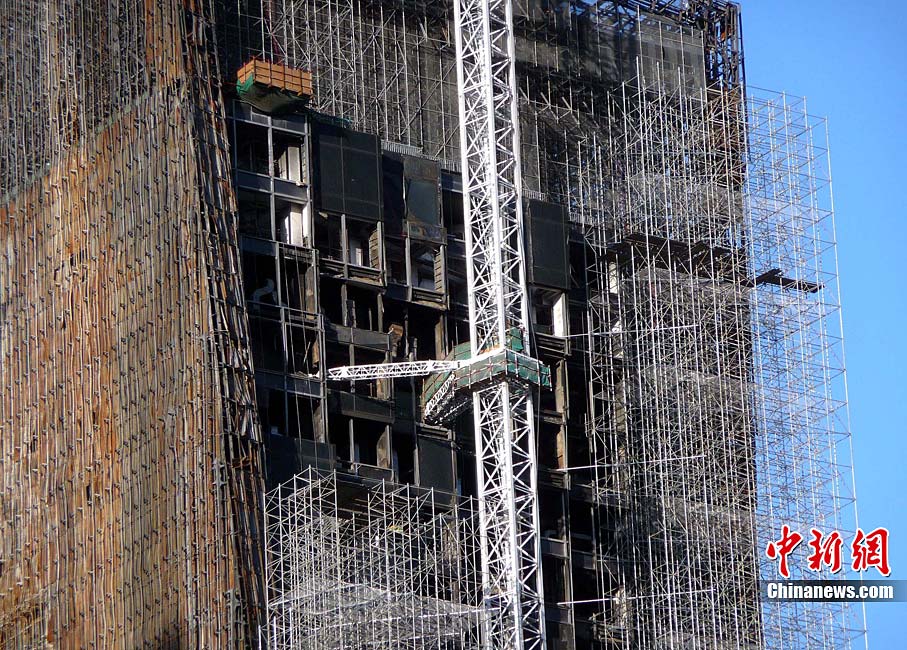 10月14日,北京央視新址,過火樓四周已開始搭起腳手架,更換外立面。與此同時,施工方已開始拆除被燒毀的合成玻璃,下月起全部更換。2009年元宵節(jié),未交工的央視新址北配樓曾燃大火,2010年8月該樓開始啟動整修。祥云 攝 圖片來源:cnsphoto