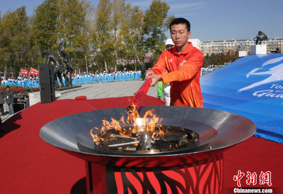 10月15日,第16屆廣州亞運(yùn)會(huì)火炬在吉林省長(zhǎng)春市進(jìn)行展示性傳遞,這是本屆亞運(yùn)會(huì)火炬?zhèn)鬟f在廣東省外的第二站。16名火炬手在長(zhǎng)春世界雕塑公園沿公園北側(cè)環(huán)路完成16棒傳遞,5000余名熱情的長(zhǎng)春市民現(xiàn)場(chǎng)見證了這一時(shí)刻。圖為最后一棒火炬手點(diǎn)燃圣火盆。中新社發(fā) 田偉 攝