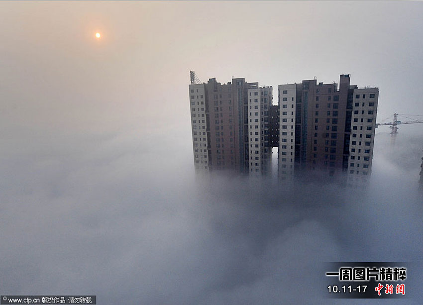 10月9日早上6點多,一場罕見的“平流霧”襲擊合肥。合肥城市的建筑掩映在濃霧中異常壯觀。王長豐 攝 圖片來源:CFP視覺中國