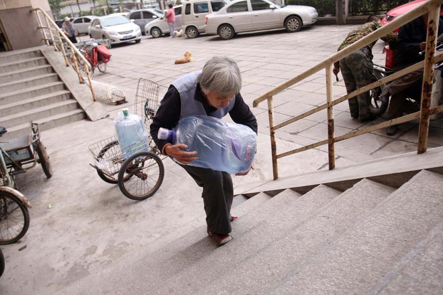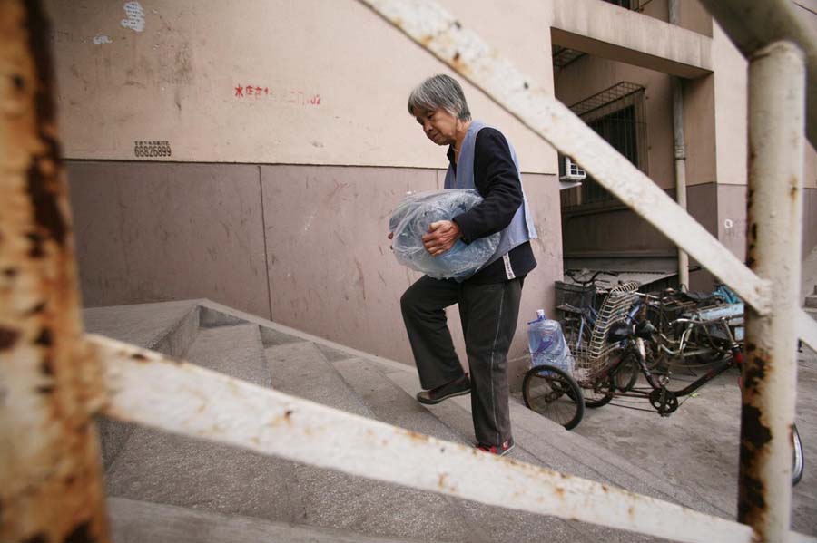 年至七旬的高美運,為了糊養(yǎng)全家、為兒孫治病,每天都要重復(fù)這個動作近百次。40斤的水桶在這個只有75斤的老人面前,實在是太沉了。為了養(yǎng)活身殘的兒子和智障的孫子,七十歲的老人高美運獨自扛起了養(yǎng)活一家人的重?fù)?dān)。為了生計,她開了一家水站,成了石景山區(qū)楊莊中區(qū)社區(qū)里有名的“送水老太太”。
