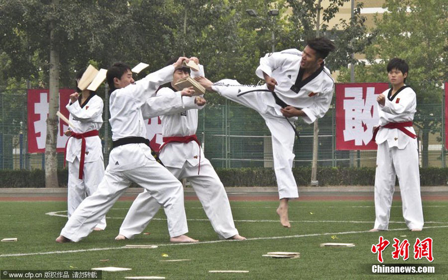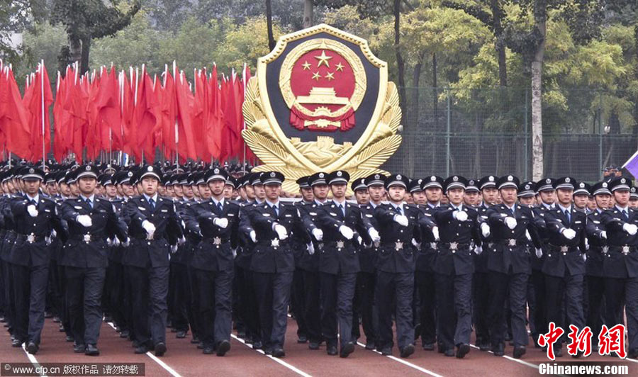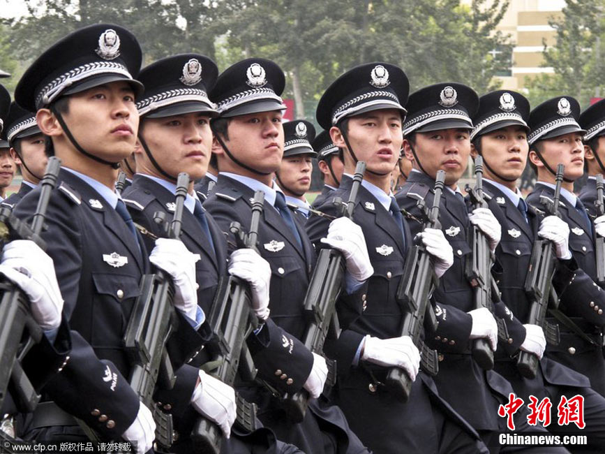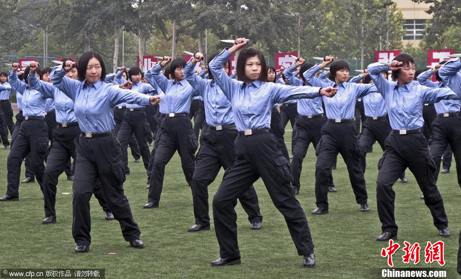2010年10月20日,中國人民公安大學(xué)新生開學(xué)儀式在北京大興校區(qū)舉行,數(shù)百位家長親臨現(xiàn)場(chǎng),觀摩了孩子們?cè)陂_學(xué)典禮上的表演。圖為女生們表演匕首制敵的招數(shù)。蒲東峰 攝 圖片來源:CFP視覺中國
