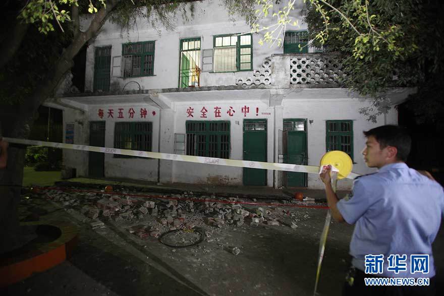 10月21日,警方在發(fā)生護欄坍塌事故的教學樓外拉起警戒線。當日下午4時40分左右,廣西柳江縣洛滿鎮(zhèn)洛滿中心小學一棟兩層教學樓二樓走廊護欄發(fā)生坍塌事故。截至21日晚9時,共有27名學生墜落不同程度受傷,4人傷勢較嚴重。