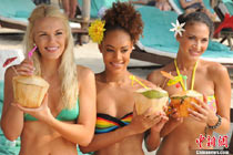10月22日,海南三亞,第60屆世界小姐總決賽當(dāng)天上午舉行運(yùn)動(dòng)小姐評(píng)比。120余位佳麗在被譽(yù)為“天下第一灣”的三亞亞龍灣上演了一場(chǎng)“最美運(yùn)動(dòng)會(huì)”。經(jīng)過賽跑、沙灘跳遠(yuǎn)、游泳三個(gè)項(xiàng)目的比拼,20歲的北愛爾蘭小姐Lori MOORE (中)獲得“運(yùn)動(dòng)小姐”桂冠,斯洛伐克小姐Marina GEORGIEVOVA (右)和挪威小姐 Mariann BIRKEDAL(左)分獲二三名。 第60屆世界小姐總決賽晚會(huì)將于10月30日舉行。中新社記者 尹海明 攝