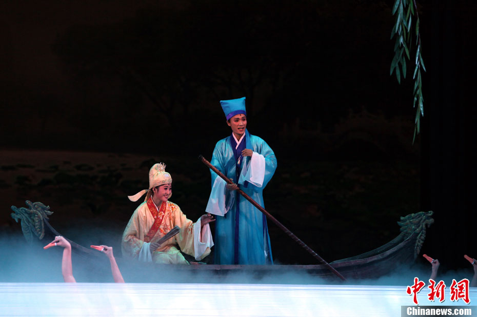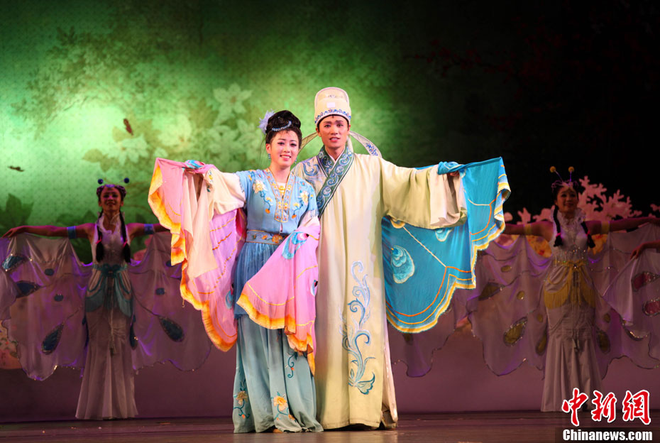 10月24日下午,朝鮮平壤大劇場上演其新排演的歌劇《梁山伯與祝英臺(tái)》。為紀(jì)念中國人民志愿軍赴朝參戰(zhàn)60周年,朝鮮血海歌劇團(tuán)把中國民間傳說《梁山伯與祝英臺(tái)》改編成歌劇。圖為該歌劇中“梁;钡木势。中新社發(fā) 孫自法 攝