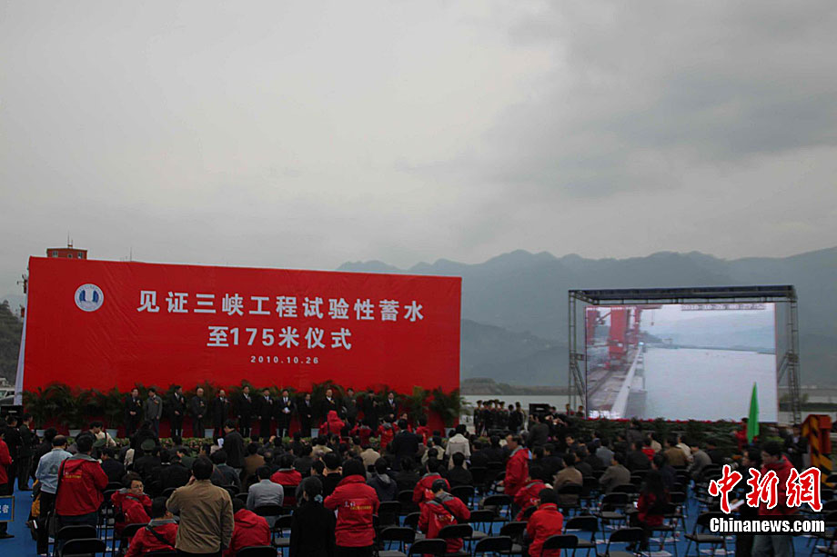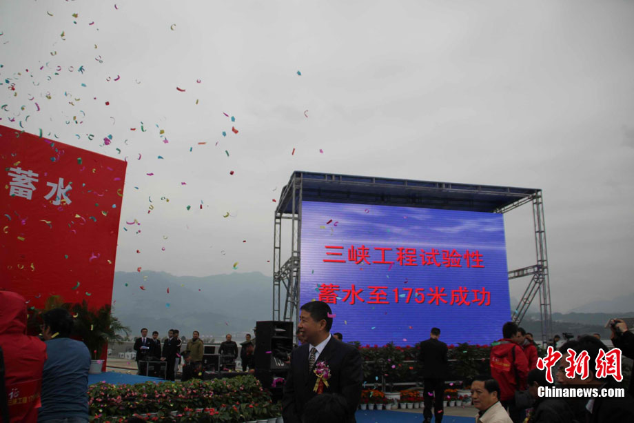 10月26日上午8時(shí)30分,在三峽大壩壩頂舉行了“見(jiàn)證三峽工程試驗(yàn)性蓄水至175米儀式”,8時(shí)55分,中國(guó)長(zhǎng)江三峽集團(tuán)公司董事長(zhǎng)曹廣晶宣布,三峽工程首次達(dá)到175米正常蓄水位,這標(biāo)志三峽工程由初期運(yùn)行期轉(zhuǎn)入正常運(yùn)行期。劉良偉 攝