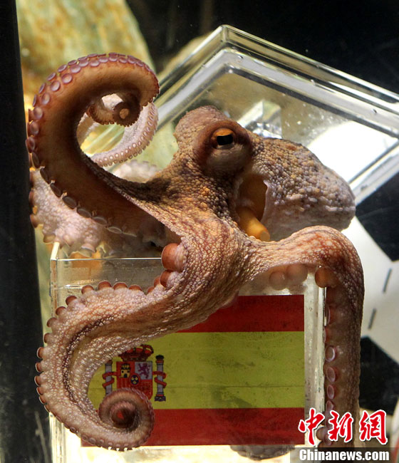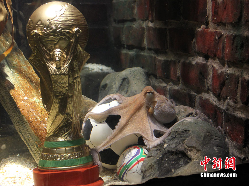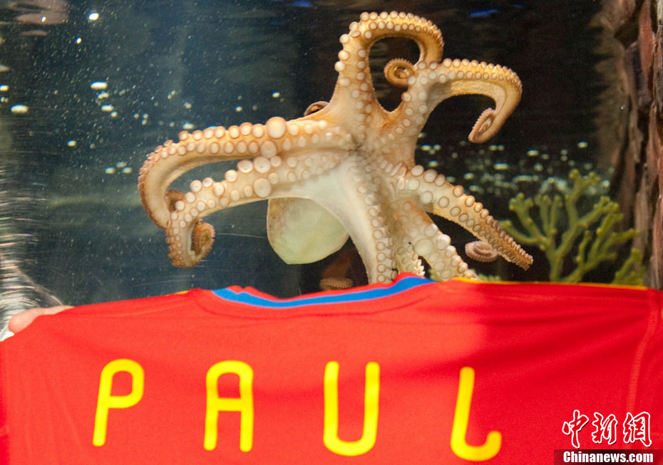 據(jù)悉,保羅的尸體目前已被冷藏,水族館正在商討“怎樣以最好的形式紀念”。圖為在世界杯后章魚保羅獲贈一件印有它名字的西班牙隊隊服。