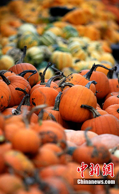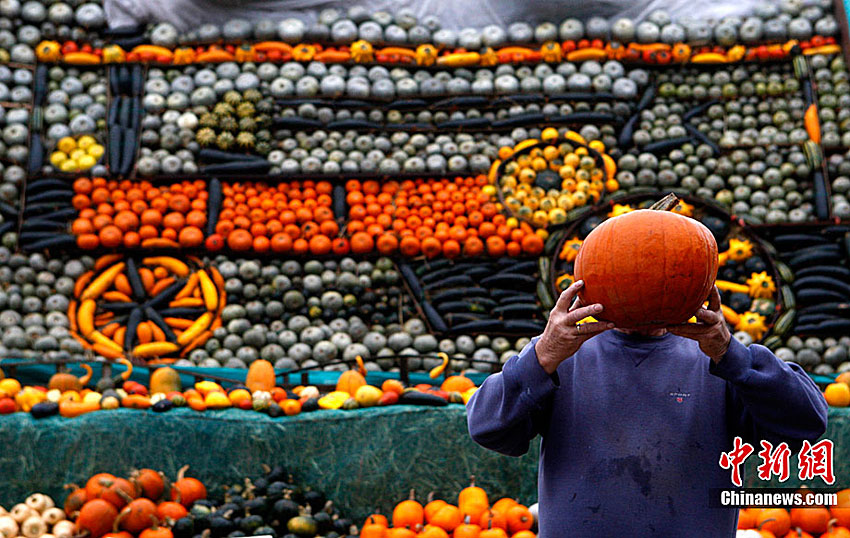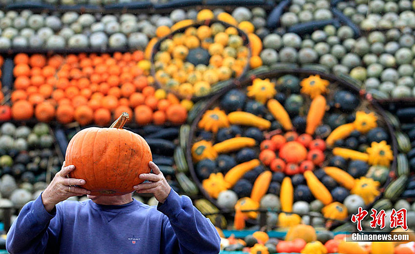 萬(wàn)圣節(jié)到來(lái)的前夕,英國(guó)斯林登老農(nóng)托尼·史密斯將自己種植數(shù)百只南瓜堆成牽引機(jī)車的模型。