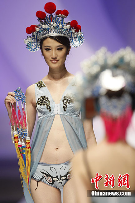 10月28日, 2010“歐迪芬杯”中國(guó)內(nèi)衣設(shè)計(jì)大賽在北京舉行,20位沖過(guò)初賽、復(fù)賽層層挑戰(zhàn)的選手們,聚集在中國(guó)內(nèi)衣設(shè)計(jì)的最高賽場(chǎng),用創(chuàng)意與靈感展開激烈角逐。圖為模特展示歐迪芬“中國(guó)紅”內(nèi)衣系列。中新社記者 盛佳鵬 攝