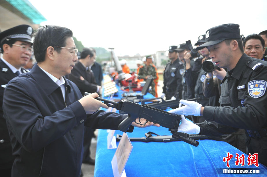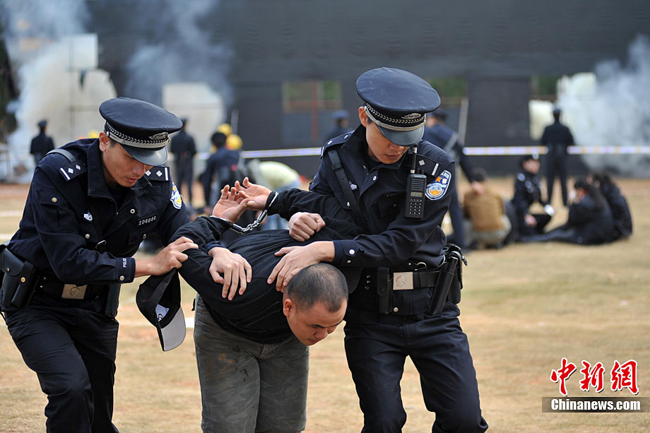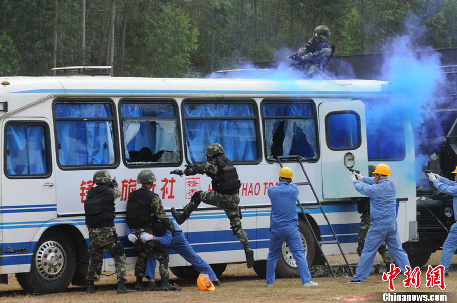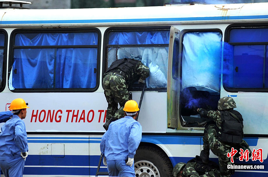 10月28日,廣西舉行亞運安保反恐演練。在演習(xí)中,警方采用了多種先進反劫持設(shè)備,模擬各種突發(fā)狀況。圖為演練被劫持大巴人質(zhì)解救過程。廣西共有八條通道通往廣東,是環(huán)粵亞運安保的重點地區(qū)之一。中新社記者 蔣雪林 攝