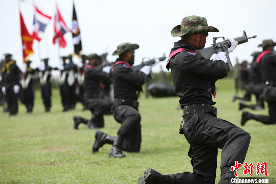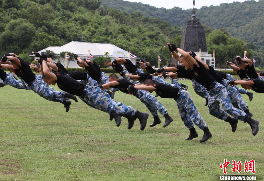 10月28日,代號(hào)為“藍(lán)色突擊—2010”的中、泰海軍陸戰(zhàn)隊(duì)聯(lián)合訓(xùn)練在泰國(guó)梭桃邑海軍基地拉開(kāi)帷幕。圖為中國(guó)海軍陸戰(zhàn)隊(duì)參訓(xùn)官兵在開(kāi)訓(xùn)儀式進(jìn)行技能演示。中新社記者 余顯倫 攝