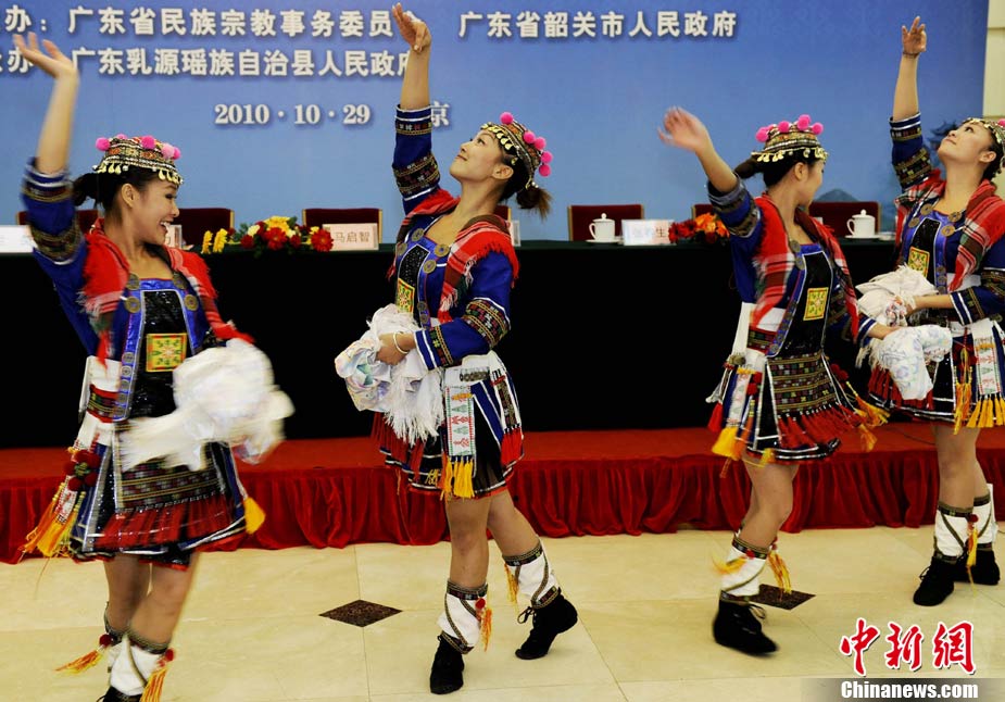 10月29日,第十一屆中國瑤族盤王節(jié)新聞發(fā)布會暨世界過山瑤之鄉(xiāng)——中國乳源旅游推介會在人民大會堂召開。本次會議發(fā)布,世界瑤族人民的盛會——第十一屆中國瑤族盤王節(jié)將于2010年11月20日至22日在廣東乳源瑤族自治縣隆重舉行,幾灞P王節(jié)是瑤族人民紀念其始祖盤王(盤瓠)的盛大節(jié)日。圖為“瑤族公主”形象代表身著湘粵桂南嶺地區(qū)的瑤族盛裝亮相新聞發(fā)布會。中新社記者 劉震 攝