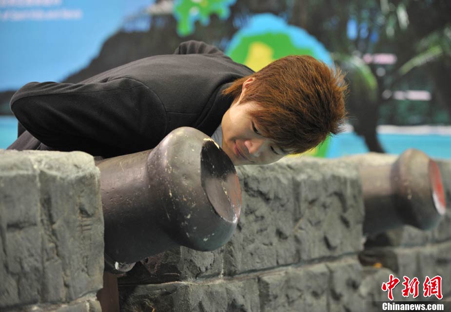 10月29日離上海世博會(huì)閉幕還有三天,一位小伙子對(duì)加勒比聯(lián)合館的古炮臺(tái)饒有興趣。中新社記者 賈國(guó)榮 攝