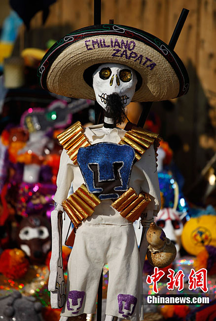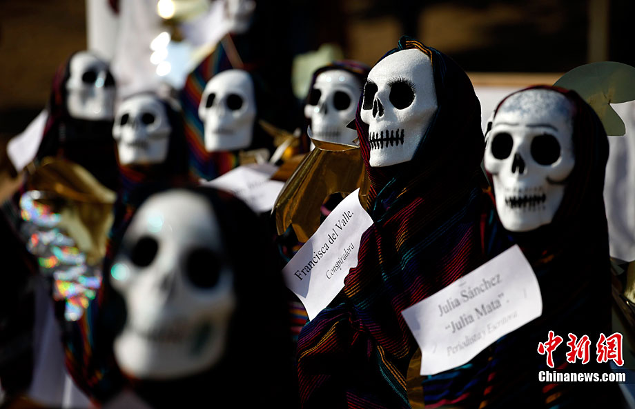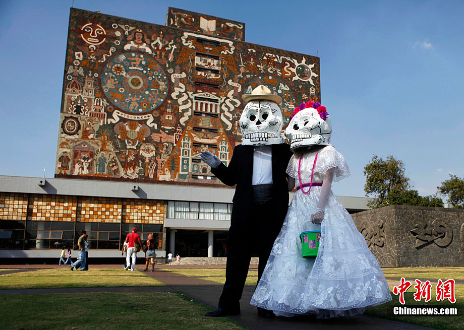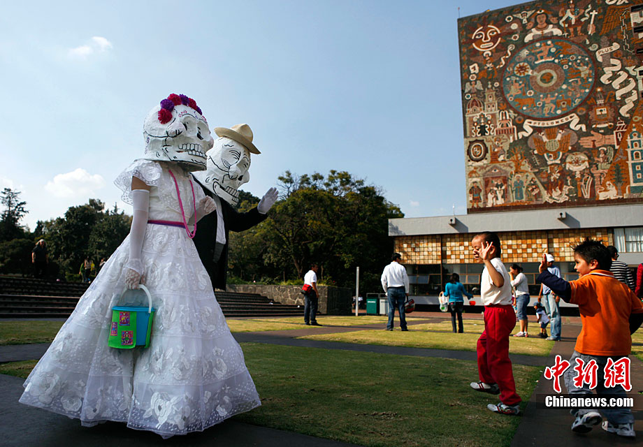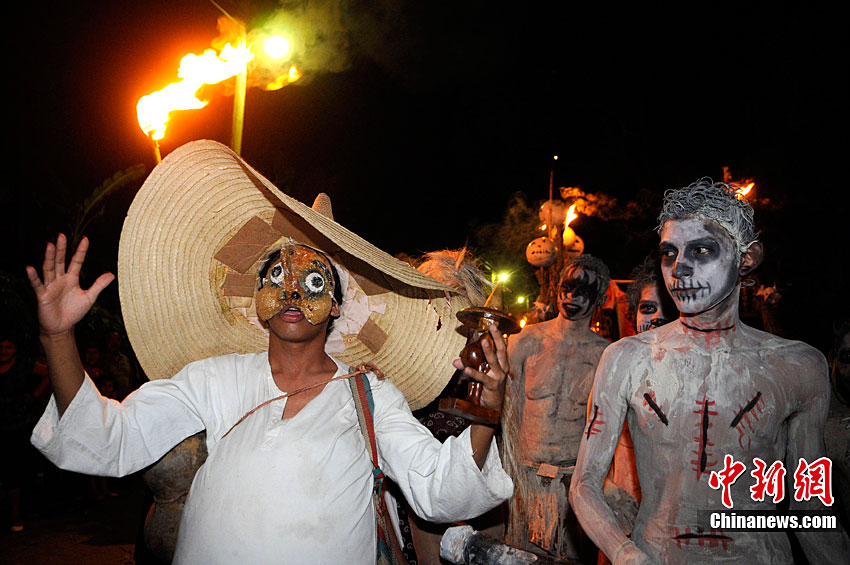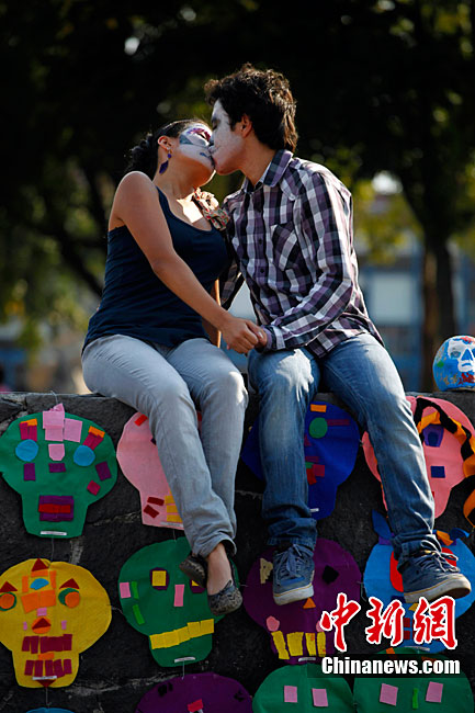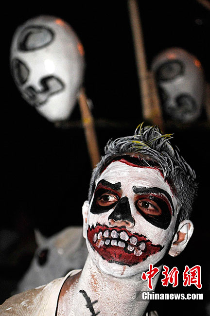 當(dāng)?shù)貢r(shí)間11月2日,拉丁美洲各國(guó)紛紛迎來(lái)傳統(tǒng)節(jié)日——亡靈節(jié)。按照當(dāng)?shù)仫L(fēng)俗,11月1日是“幼靈”節(jié);2日是“成靈”節(jié)。人們?cè)谀沟赝ㄍ迩f或者小鎮(zhèn)的路上撒了黃色的花瓣,讓亡靈循著芬芳的小路歸來(lái)。晚間,在家門口點(diǎn)上南瓜燈籠,為亡靈上門引路;在祭壇上擺著玉米羹、巧克力、面包、粽子、辣醬、南瓜、甜食、甜點(diǎn)等供品,讓亡靈享用。節(jié)日里,無(wú)分男女老幼,都可以戴著面具,穿上印著白骨的鬼怪衣服,在街上招搖過(guò)市,表示亡靈歸來(lái)。 圖為墨西哥民眾慶祝亡靈節(jié)。