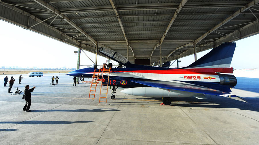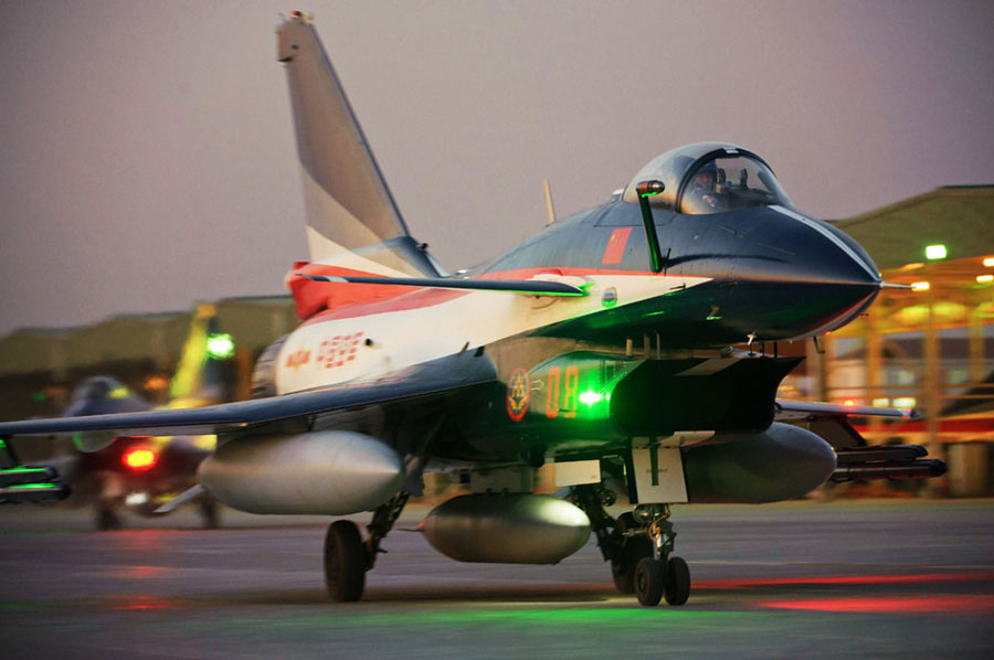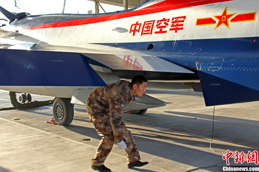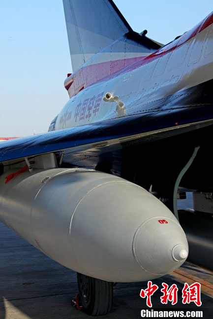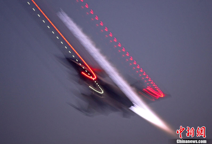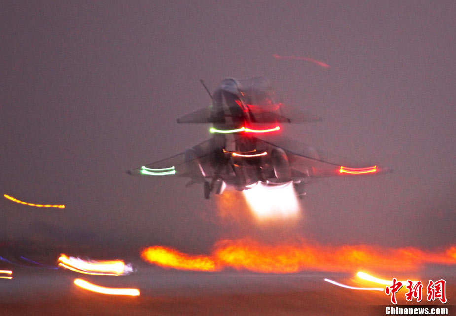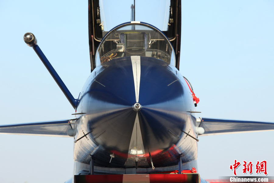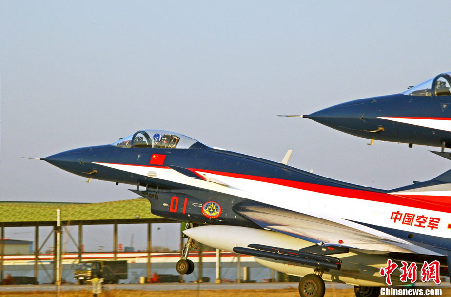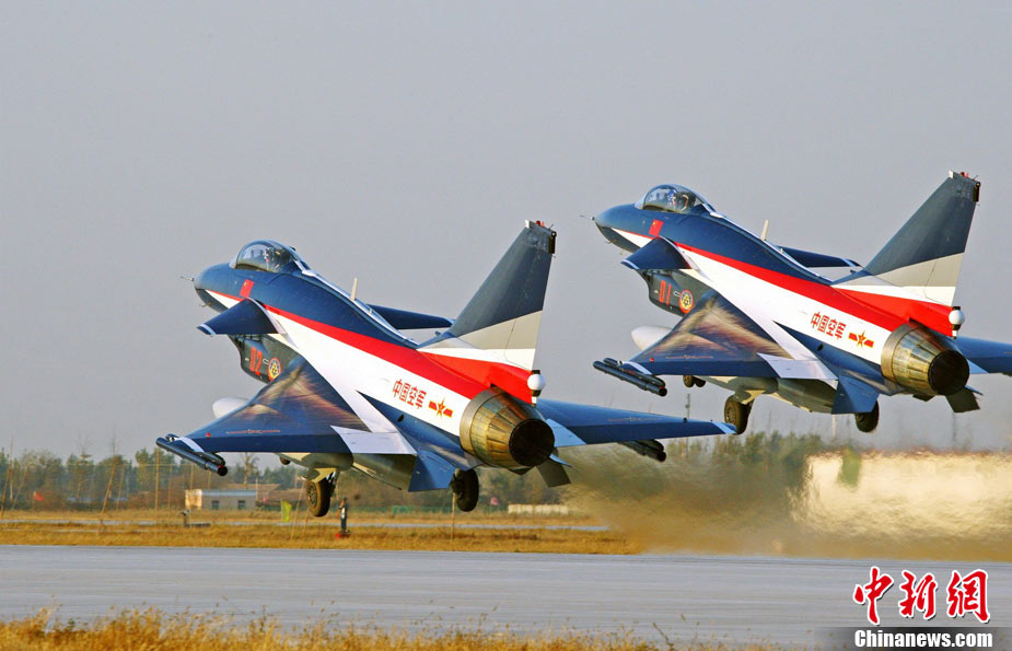 11月初,中國(guó)空軍八一飛行表演隊(duì)新涂裝的殲10飛機(jī)雙機(jī)起飛?哲姲艘伙w行表演隊(duì)7架殲—10戰(zhàn)機(jī)近日將飛赴珠海,參加11月16日至21日舉行的第8屆中國(guó)國(guó)際航空航天博覽會(huì)(珠海航展)。這是表演隊(duì)換裝殲—10戰(zhàn)機(jī)后,首次以新涂裝向世人正式亮相?哲娺將派出殲—8F、殲轟—7A、轟—6H、空警—200、直—8KA、直—9WA等7型飛機(jī),參加這次國(guó)際性綜合航展。中新社發(fā) 譚超 攝