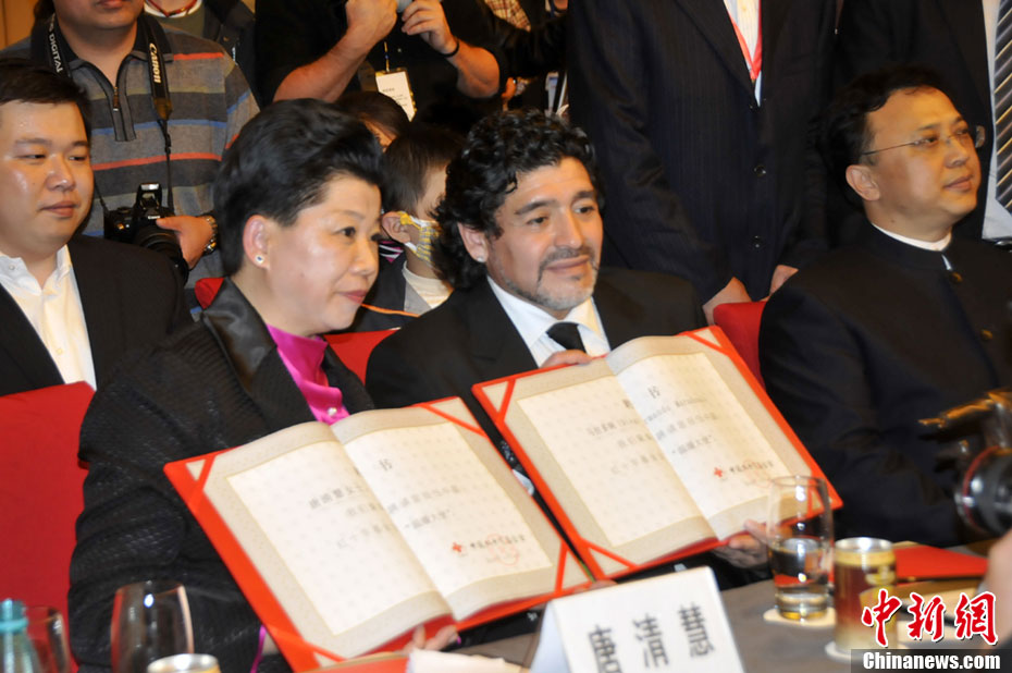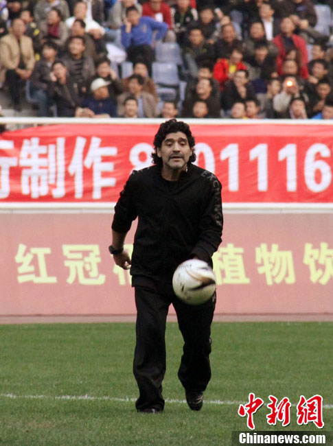 11月5日下午16時左右,世界球王馬拉多納來到山東濟(jì)南奧體中心參加山東聯(lián)隊與阿根廷明星隊的慈善比賽。圖為馬拉多納向現(xiàn)場的觀眾和球迷揮手致意。中新社發(fā) 牛杰峰 攝