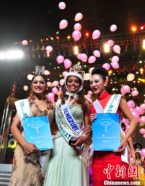 11月7日晚,第50屆國(guó)際小姐世界大會(huì)全球總決賽在成都拉開帷幕。來自全球70個(gè)國(guó)家和地區(qū)的70名佳麗經(jīng)過激烈角逐,最終委內(nèi)瑞拉小姐Elizabeth Mosquera摘得桂冠,泰國(guó)小姐Piyaporn Deejing、中國(guó)小姐袁思怡分獲亞軍和季軍。圖為各國(guó)佳麗的進(jìn)行泳裝展示。中新社發(fā) 安源 攝