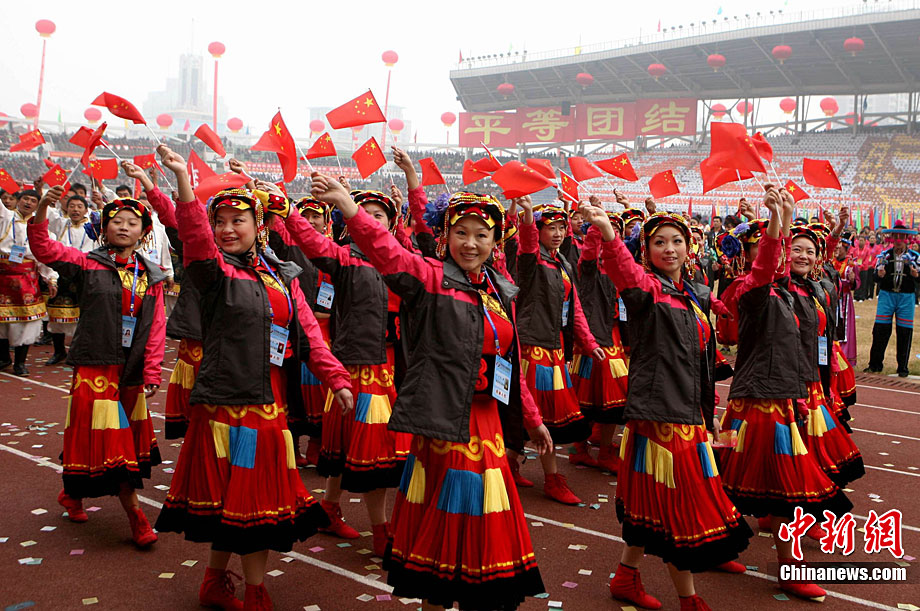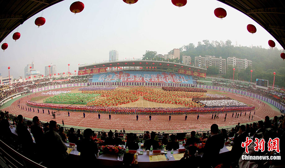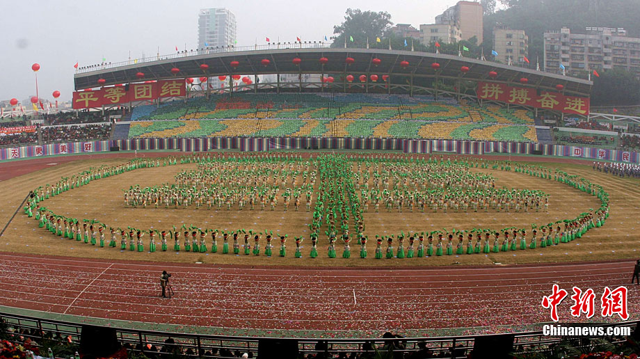 11月10日,四川省第13屆少數(shù)民族體育運動會在攀枝花拉開帷幕。來自涼山州、甘孜州、阿壩州、樂山市、雅安市等10個市州以及西南民族大學、成都體育學院共12支代表隊1066名運動員,將參加陀螺、民族式摔跤、田徑等9個競賽項目7天的比賽。本次運動會是四川歷屆少數(shù)民族運動會規(guī)模最大的一次,所有項目均可免費觀看。中新社發(fā) 劉忠俊 攝