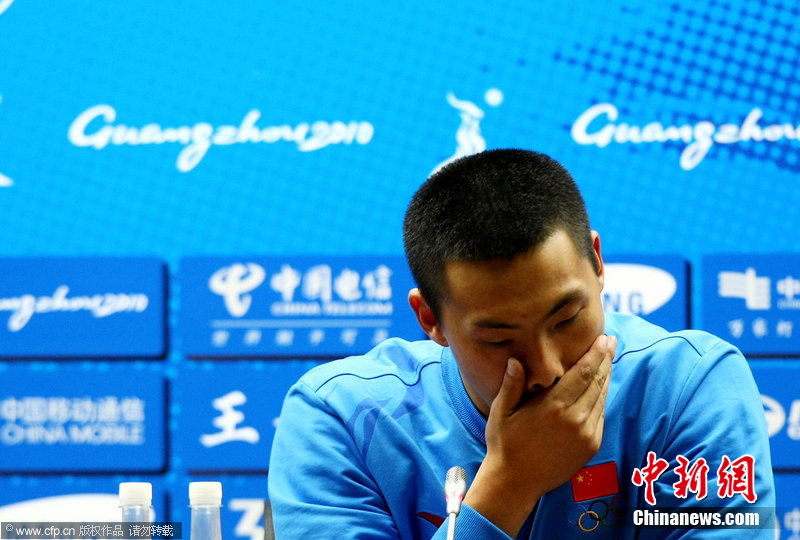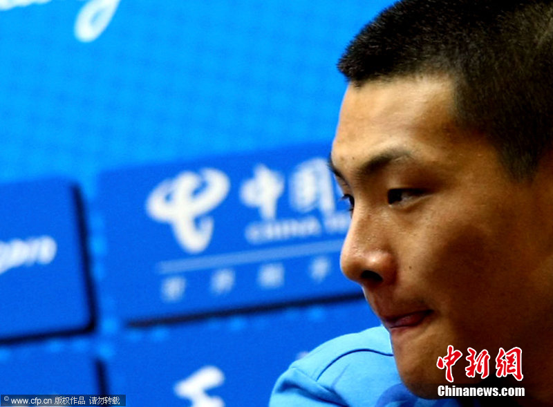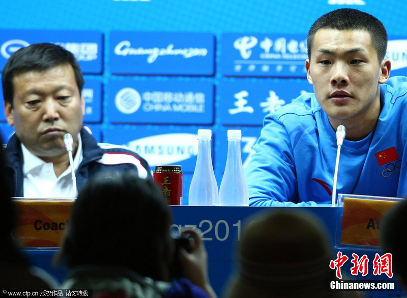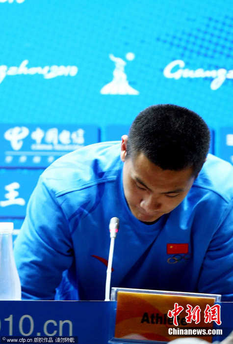 2010年11月10日,廣州,2010亞運(yùn)會(huì)男足A組次輪,中國(guó)Vs吉爾吉斯斯坦。王大雷出席賽后新聞發(fā)布會(huì),就此前在微博上辱罵球迷的行為道歉。圖片來(lái)源:CFP視覺中國(guó)