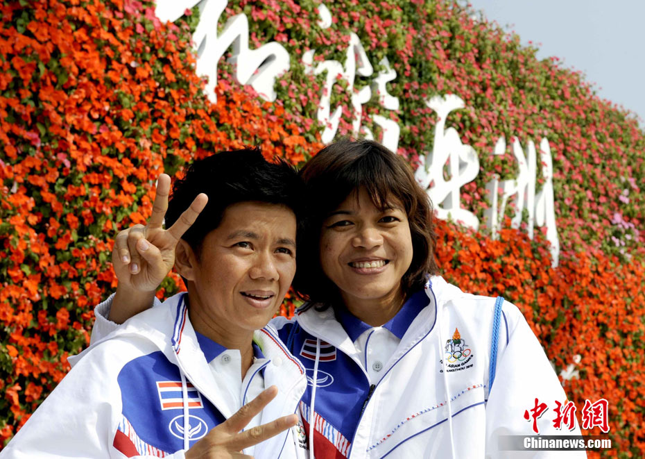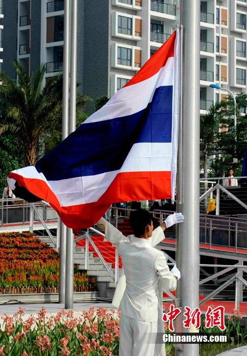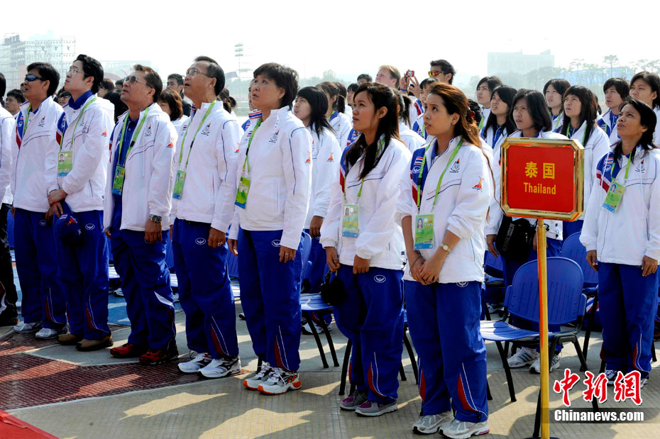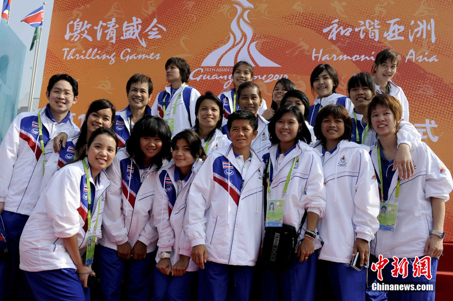 11月11日,泰國代表團舉行廣州亞運會亞運村升旗儀式。圖為泰國運動員在現(xiàn)場合影留念。中新社記者 王東明 攝