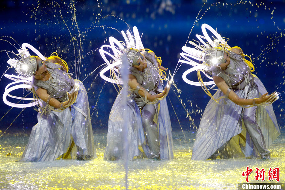 11月12日晚,第16屆亞運會開幕式在廣州海心沙舉行,宏大、絢麗的文藝匯演《啟航》給亞洲以及世界觀眾帶來藝術(shù)盛宴。水是廣州亞運開幕式最主要的創(chuàng)意元素,幕式的表演從一滴水到汪洋大海,從一葉扁舟到巨型帆船,從一汪情水到滔天巨浪。演員們用各種表演手段盡情展現(xiàn)水的魅力,表達水是生命之源、滋養(yǎng)萬物、呵護人類文明的精神內(nèi)涵,令人嘆為觀止。中新社記者 杜洋 攝