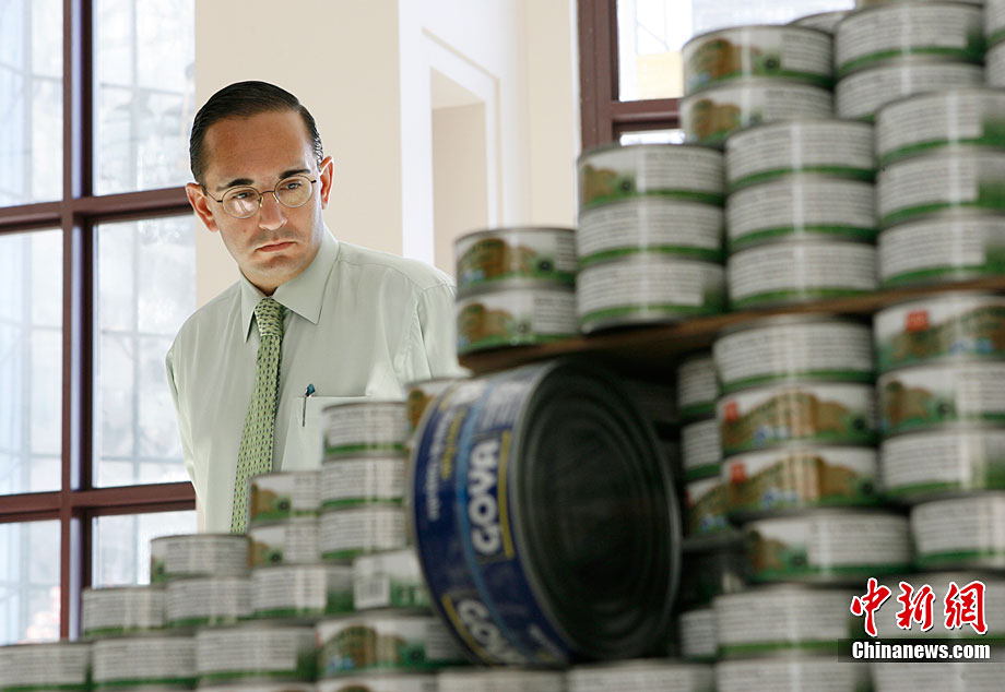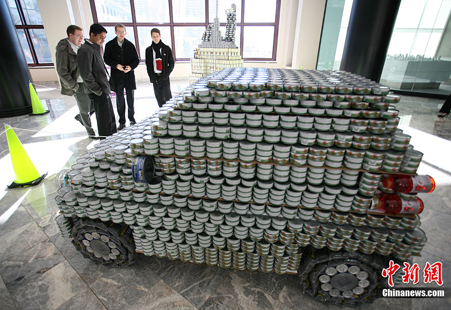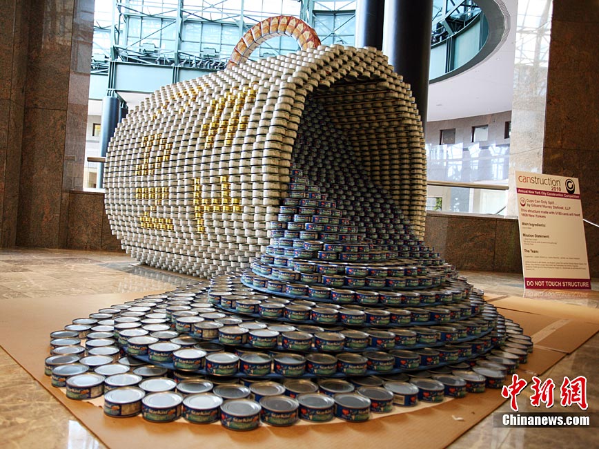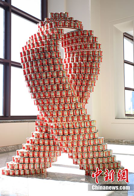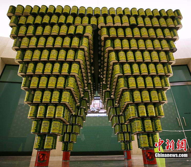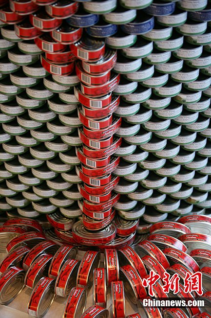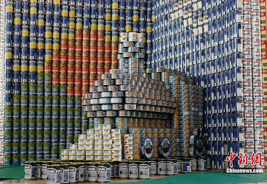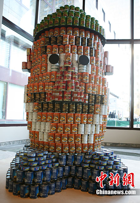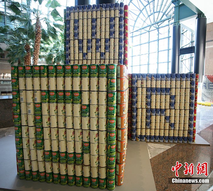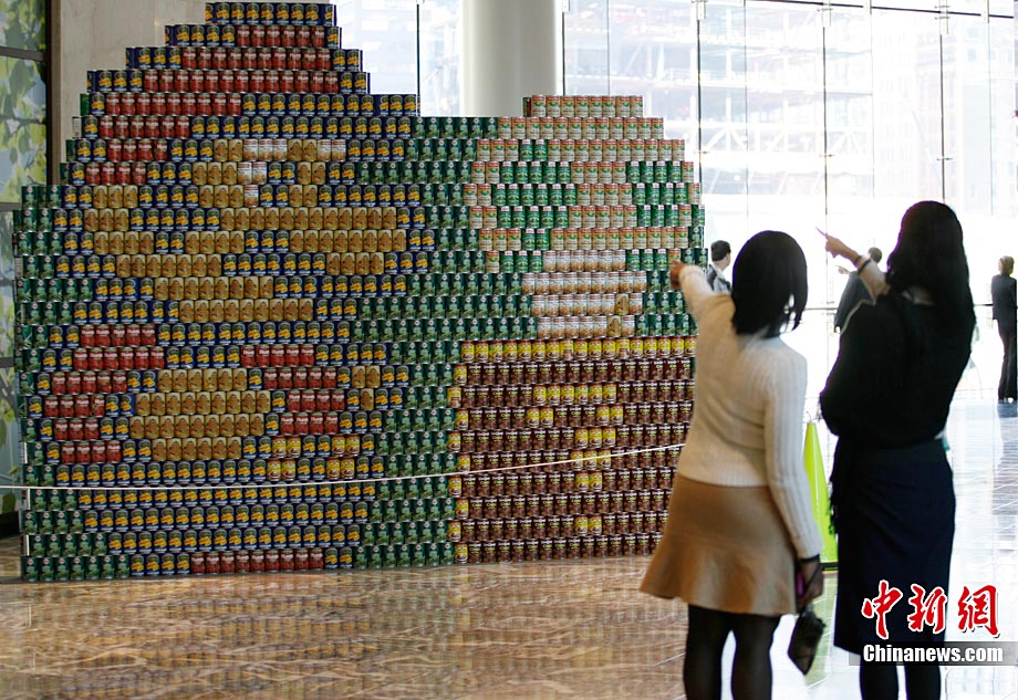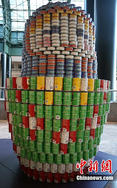 當?shù)貢r間11月11日,美國紐約世界金融中心的冬園展出了一組用各種食品罐頭組合成的雕塑作品。此次展覽結束后,這些作品將被拆除,所有的罐頭都將被捐給慈善機構“城市收獲”,用來援助仍在忍受饑餓的人。