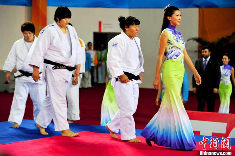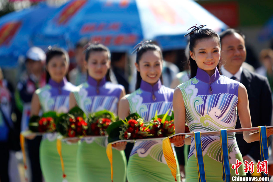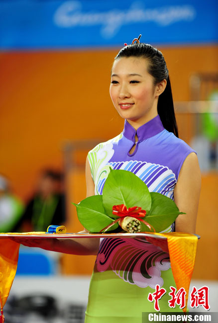 11月13日,2010年廣州亞運(yùn)會(huì)展開了首日的爭(zhēng)奪,當(dāng)日射擊比賽共產(chǎn)生6枚金牌。圖為漂亮的禮儀小姐。中新社記者 盛佳鵬 攝