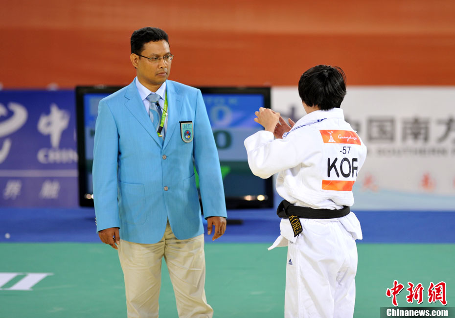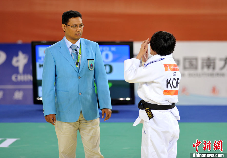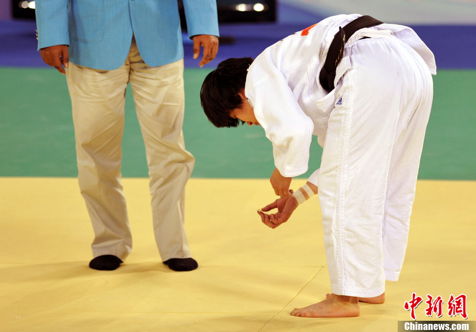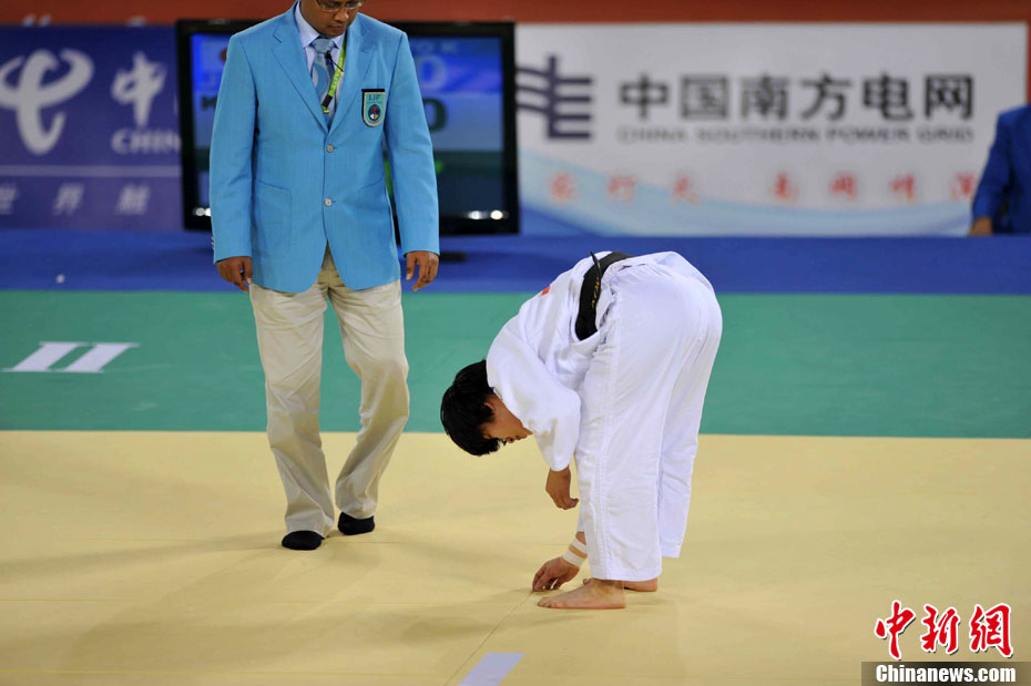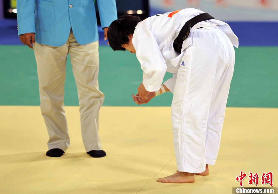 11月15日晚舉行的柔道女子57公斤級(jí)決賽上,韓國(guó)選手金珍迪在較量中遺失了隱形眼鏡,不得不暫停比賽四處尋找,最后被日本選手松本薰擊敗。 圖為韓國(guó)選手金珍迪找到了隱形眼鏡。中新社記者 柯小軍 攝