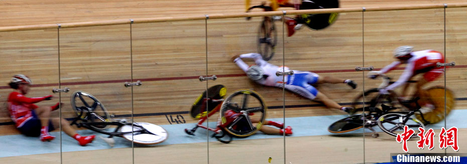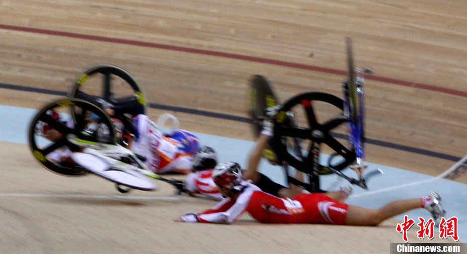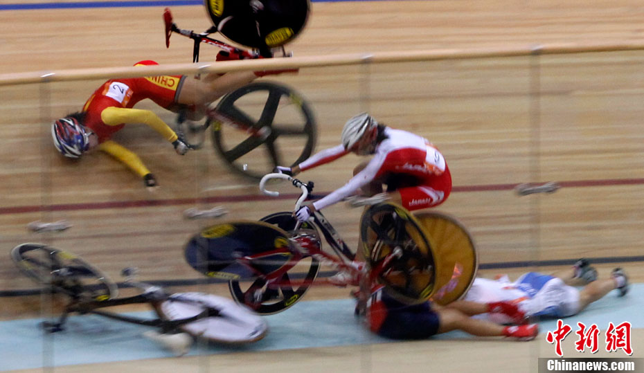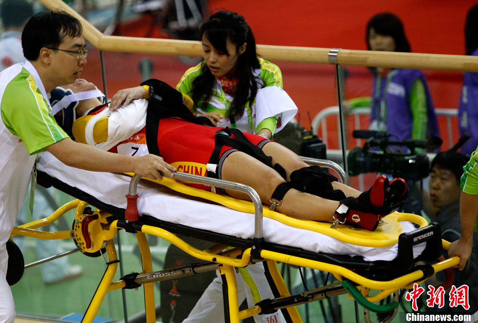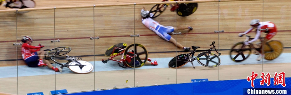 11月16日,廣州亞運(yùn)會(huì)自行車比賽進(jìn)入第四天,在女子積分賽比賽的最后沖刺階段,突發(fā)嚴(yán)重車禍,七位比賽選手均翻車倒地被送往醫(yī)院救治。其中中國的湯科蓉傷勢最為嚴(yán)重,被送往醫(yī)院急救。中新社記者 趙振清 攝