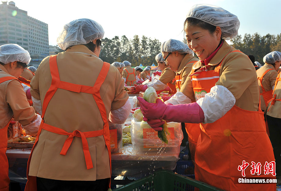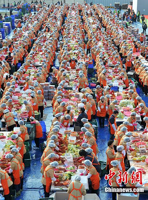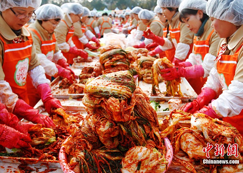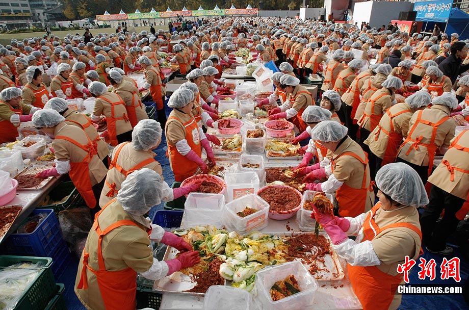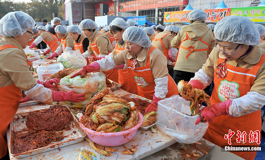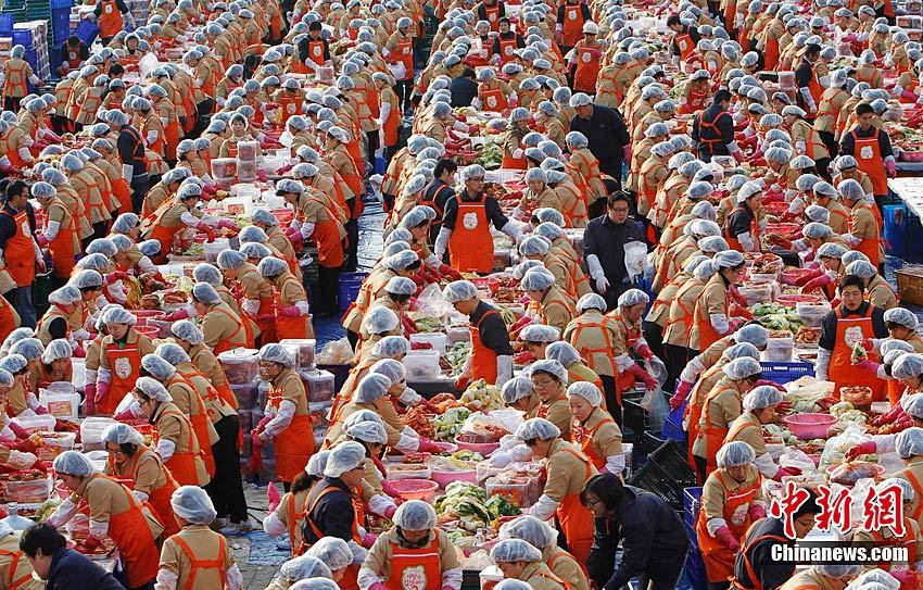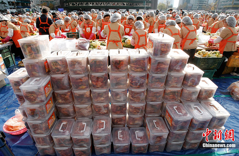 11月16日,幾千名韓國市民聚集首爾廣場,腌制總共12萬顆白菜泡菜,贈給低收入家庭。泡菜是韓國最不可或缺的食物,冬季漸近,腌制白菜泡菜更成為韓國人生活中一件大事。