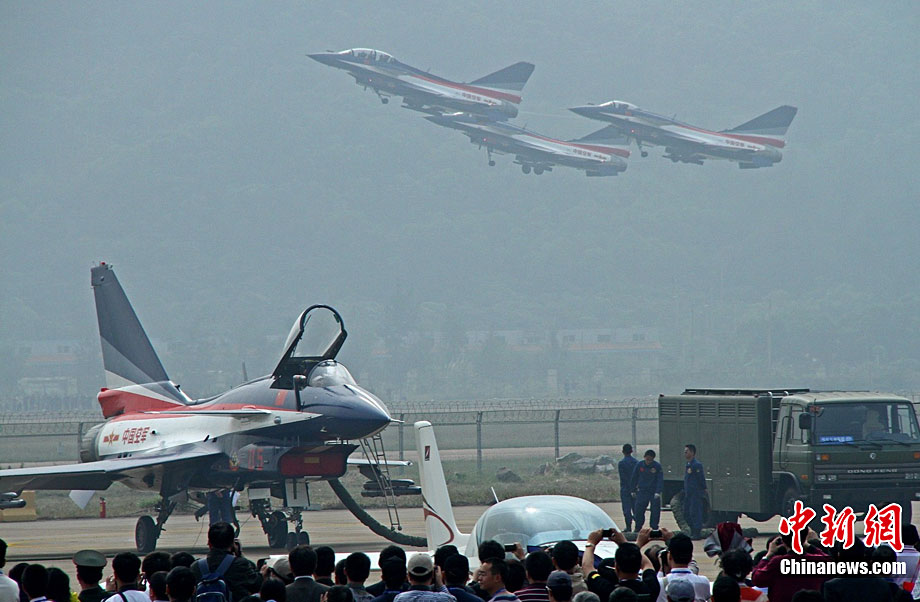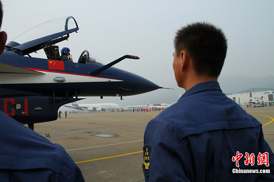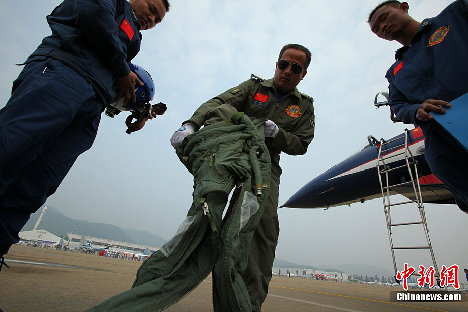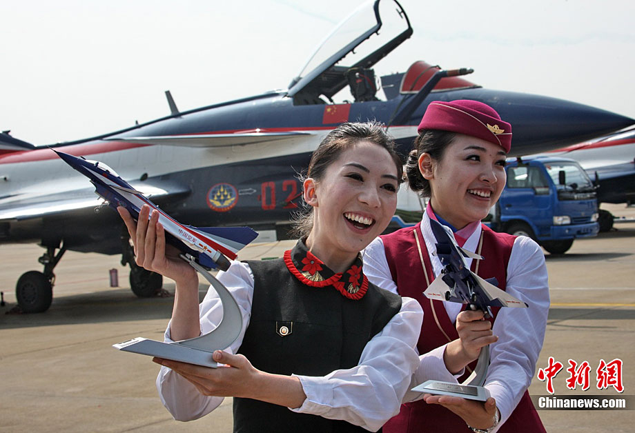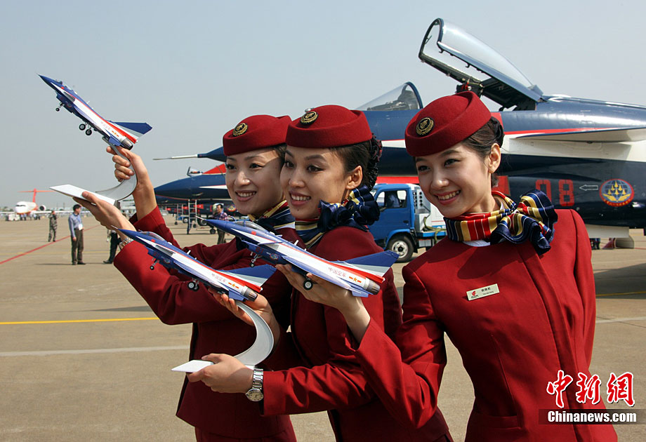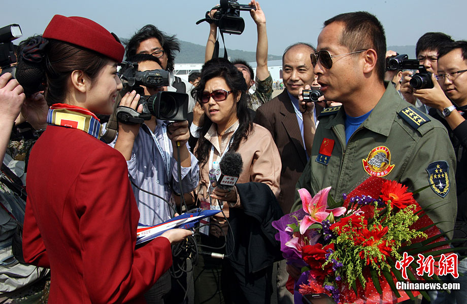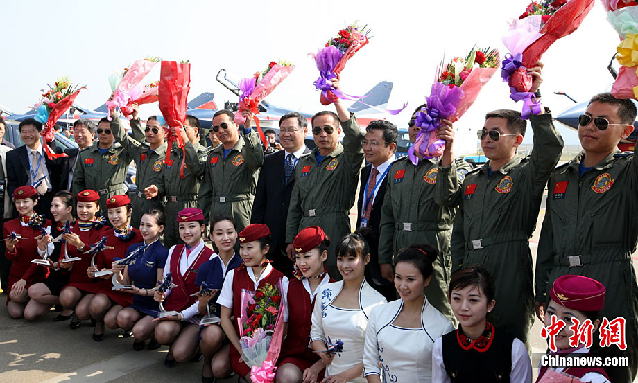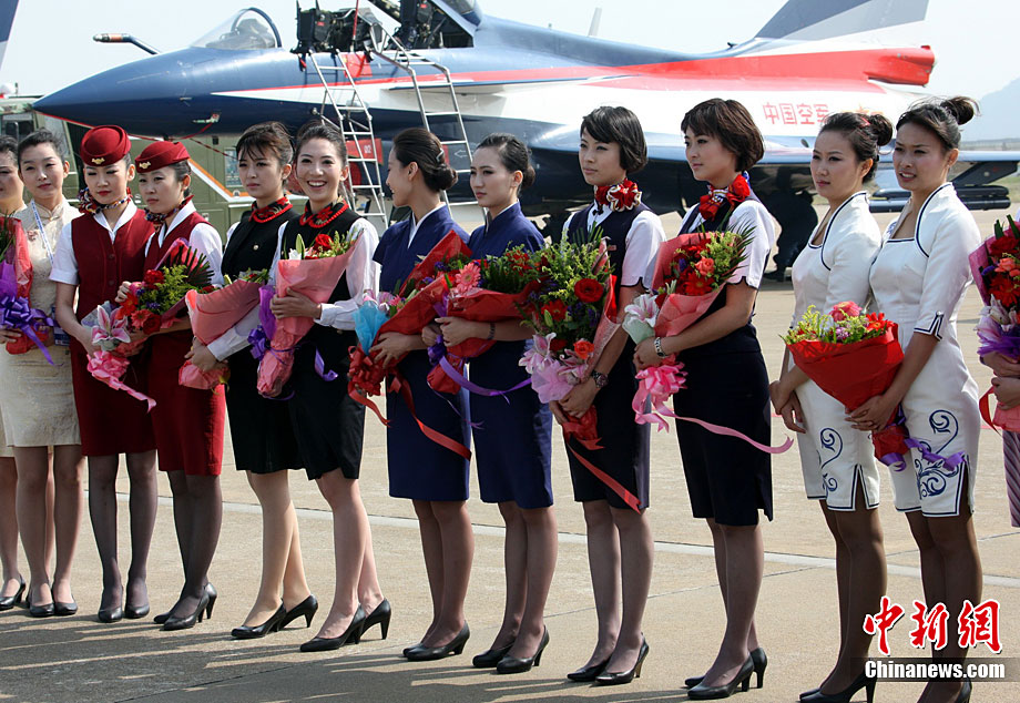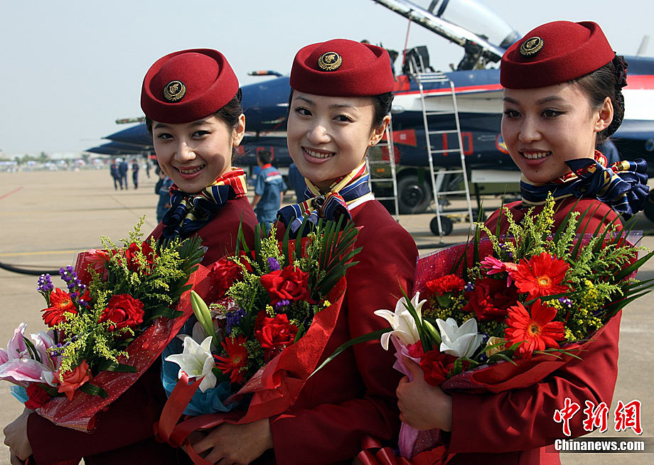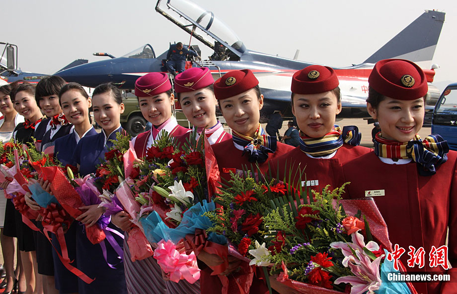 11月17日,在珠海第8屆中國(guó)國(guó)際航空航天博覽會(huì)上,中航公司組織中國(guó)獲獎(jiǎng)十佳空中乘務(wù)員,向殲10飛機(jī)總設(shè)計(jì)師、剛做完飛行表演的空軍八一飛行表演隊(duì)的空中英豪們獻(xiàn)上鮮花。圖片來源:CNSPHOTO 喬天富 攝