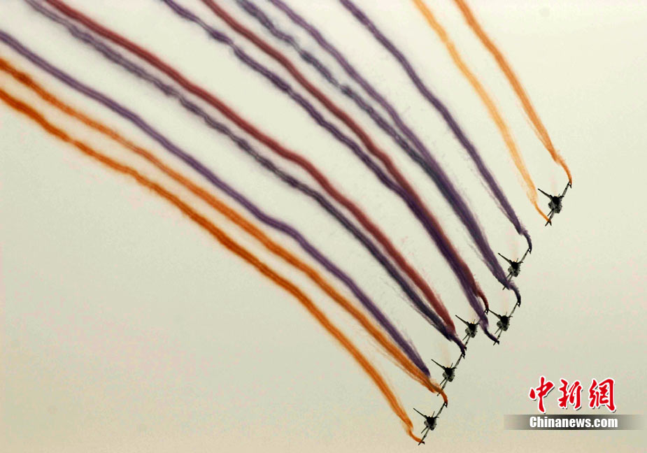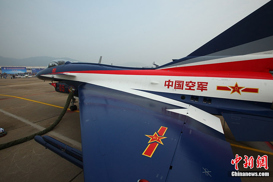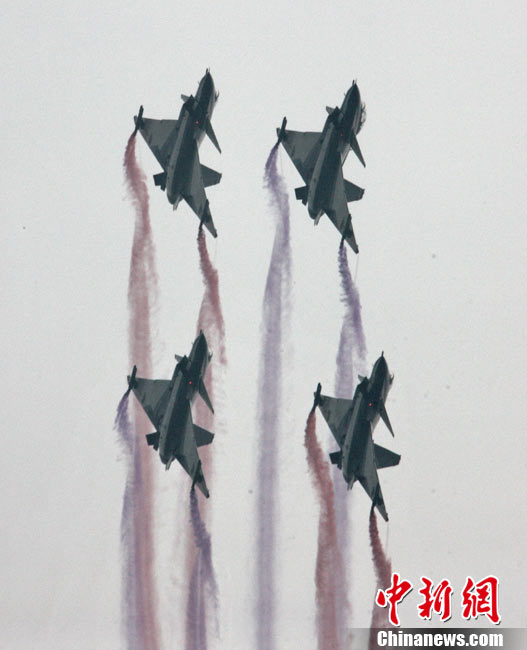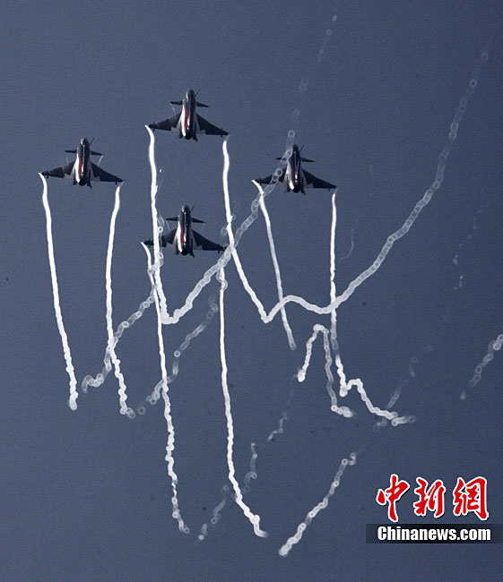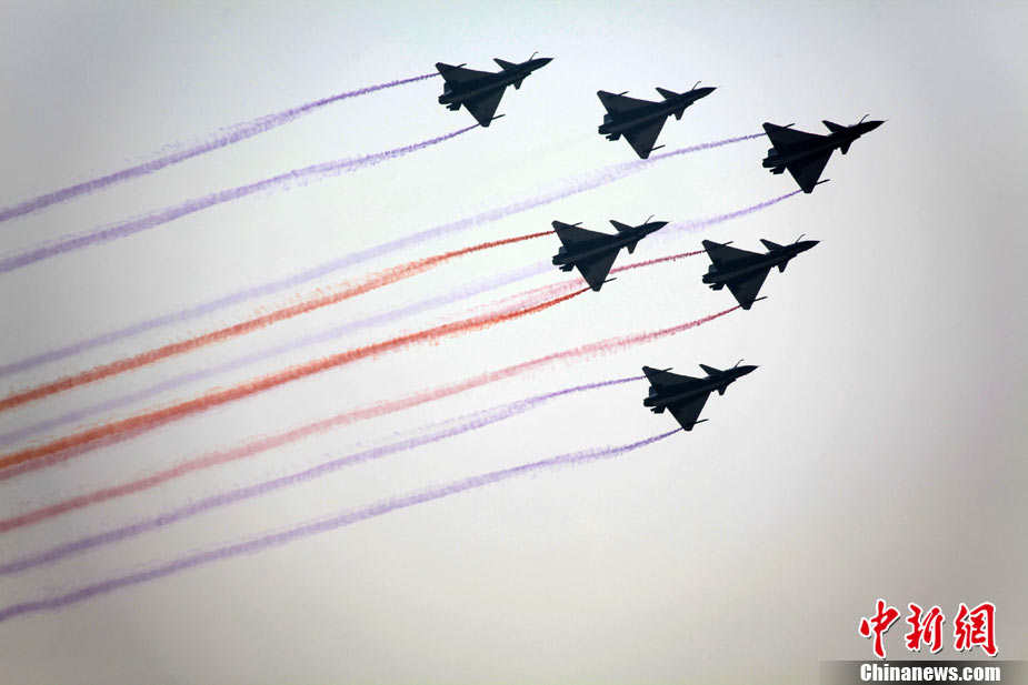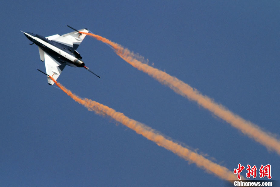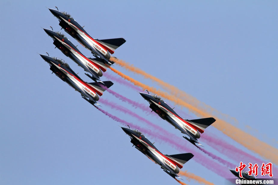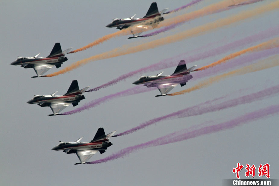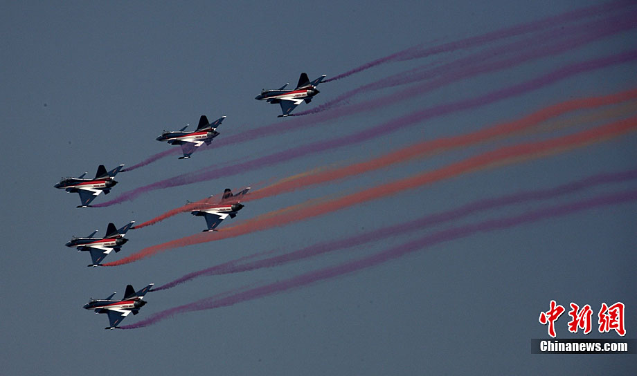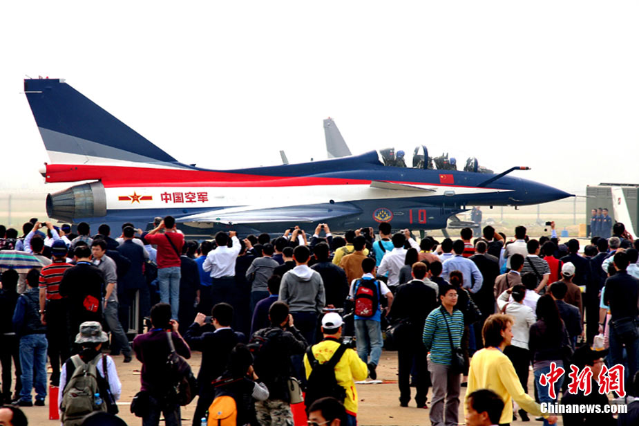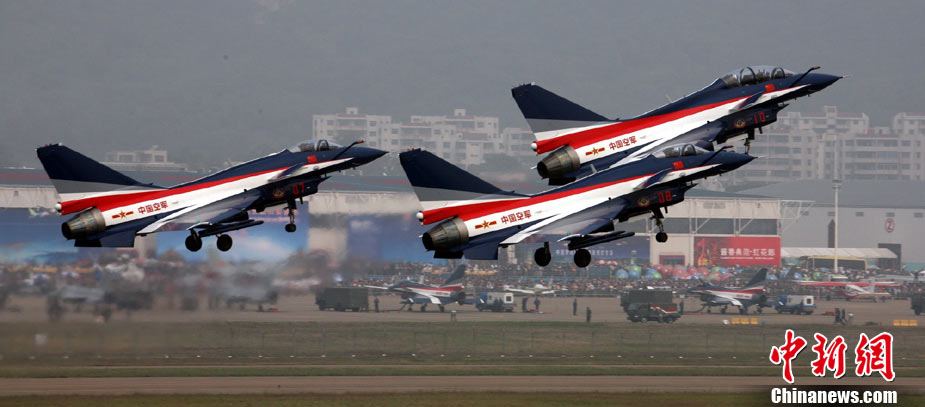 11月17日,在珠海第8屆中國(guó)國(guó)際航空航天博覽會(huì)上,中航公司組織中國(guó)獲獎(jiǎng)十佳空中乘務(wù)員,向殲10飛機(jī)總設(shè)計(jì)師、剛做完飛行表演的空軍八一飛行表演隊(duì)的空中英豪們獻(xiàn)上鮮花。圖片來源:CNSPHOTO 喬天富 攝